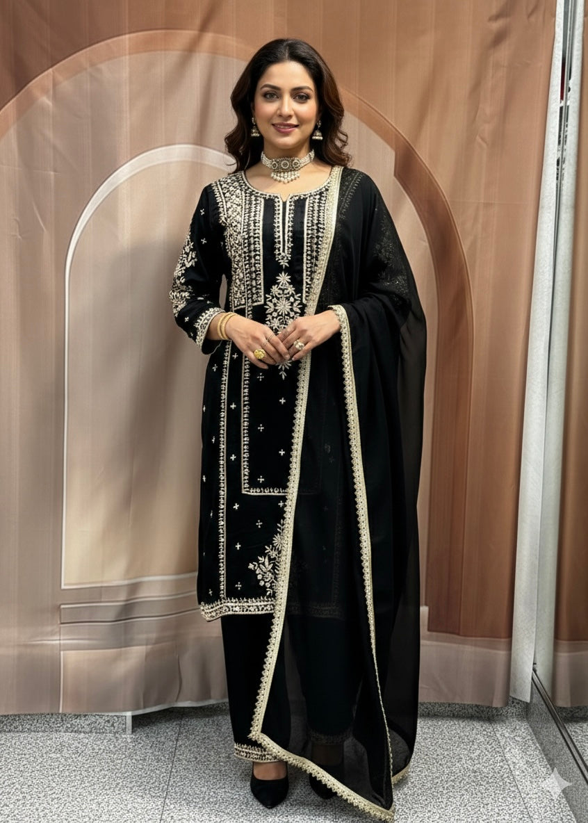 • Embroidery: Features intricate Zari or silver thread work. The neckline is a classic "V" or round notched shape, heavily embellished with floral and geometric patterns that extend down the center (the patti).