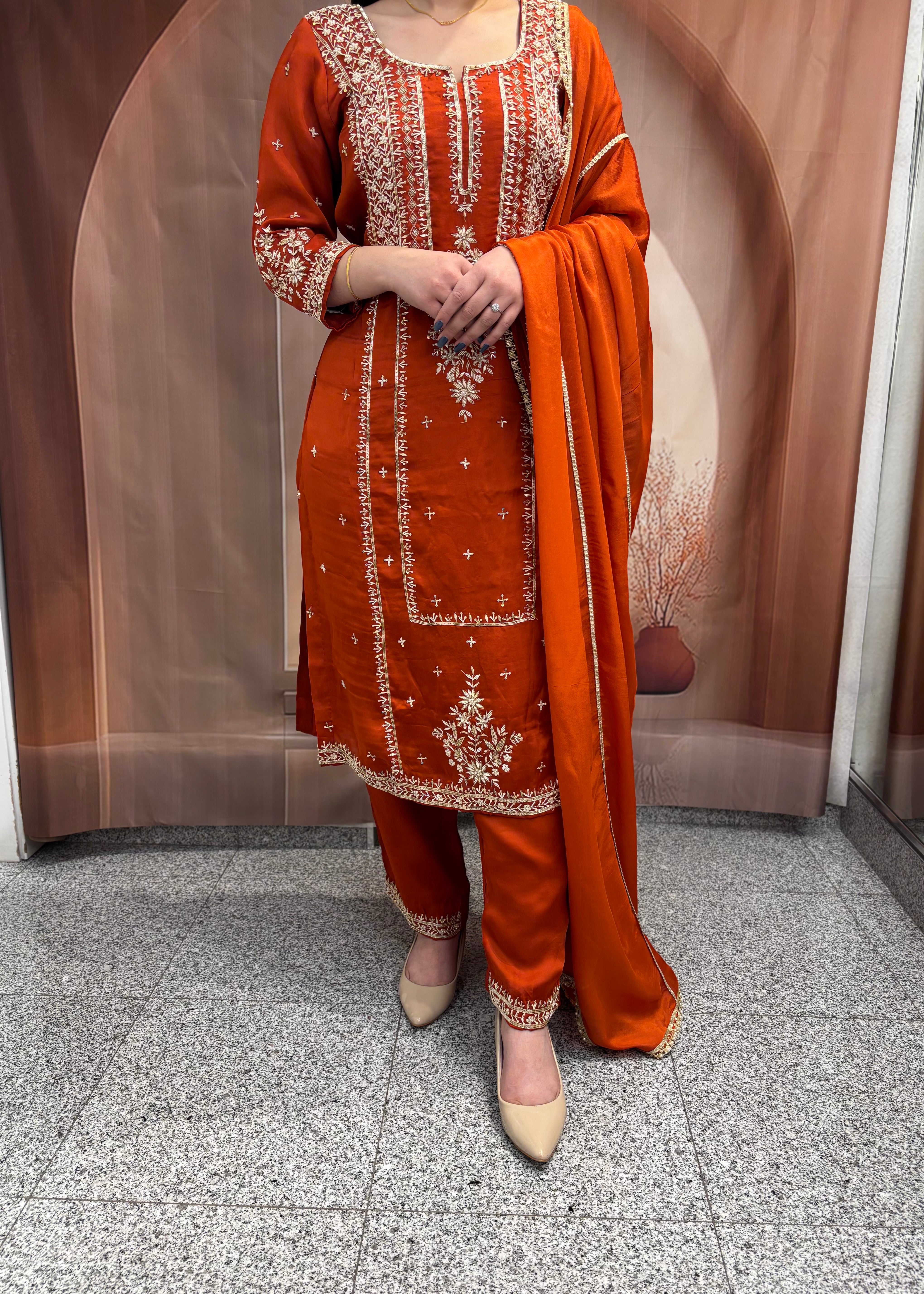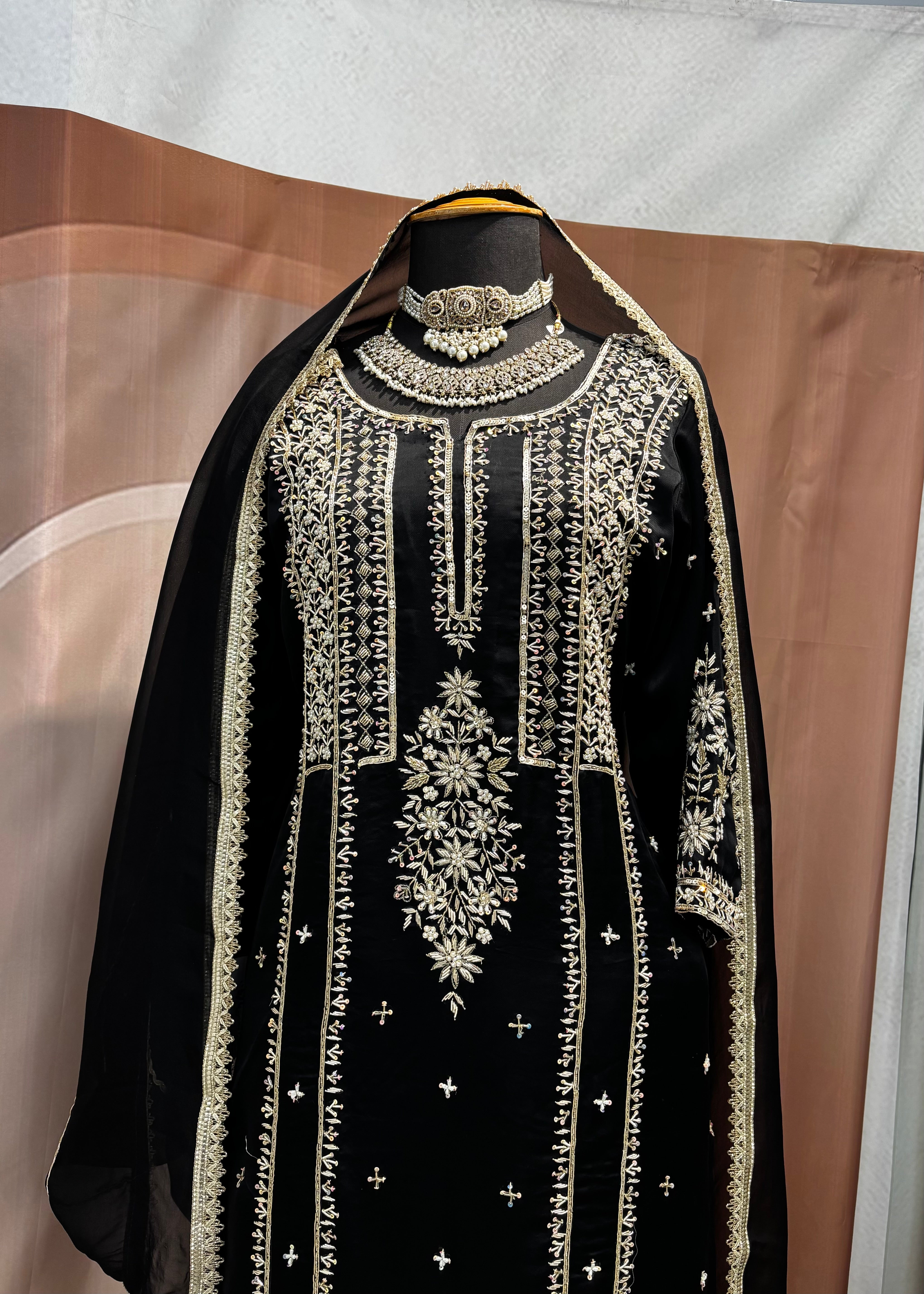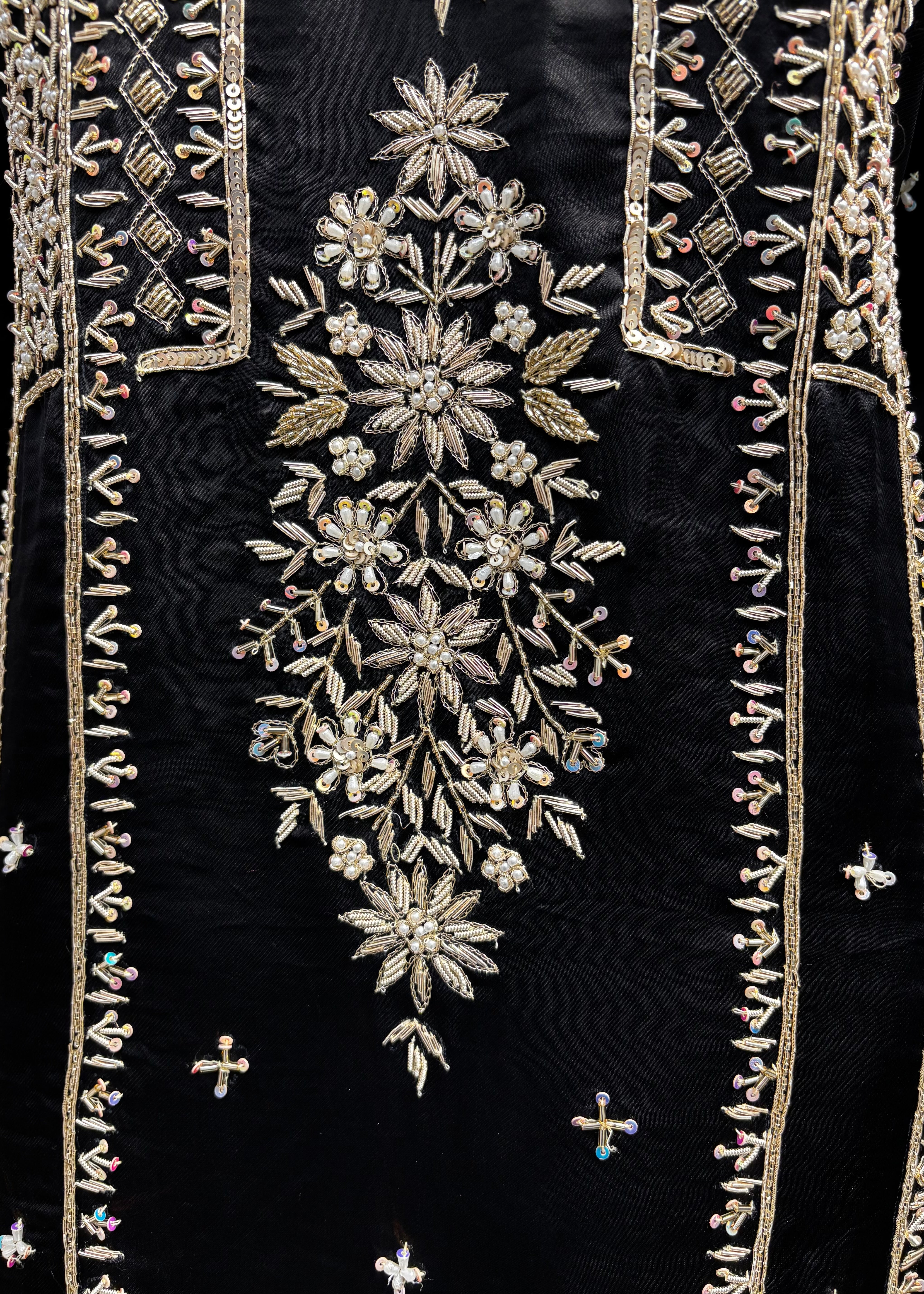• Details: Small embroidered motifs (butis) are scattered across the front, with a broad, ornate border (ghera) at the hemline.