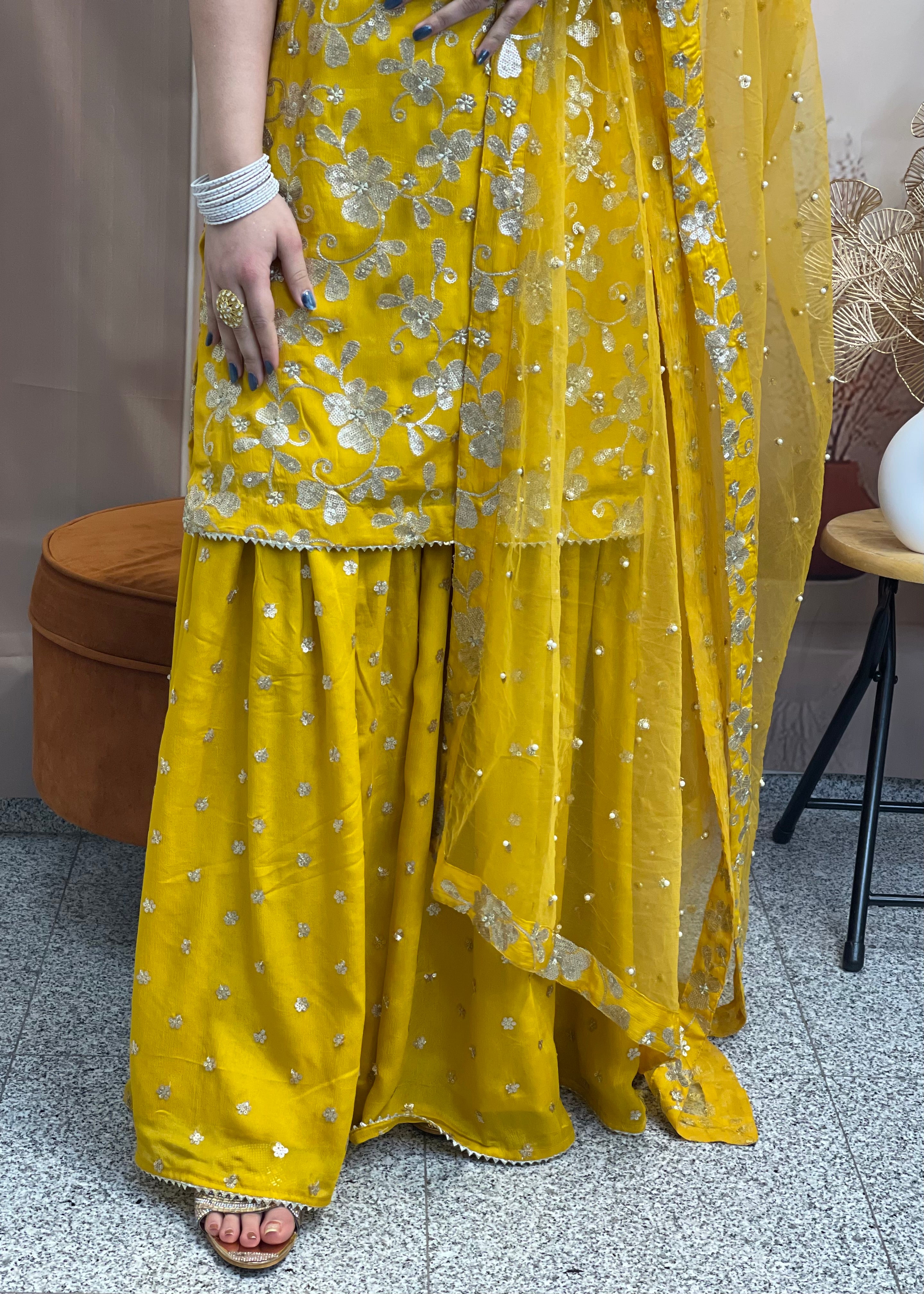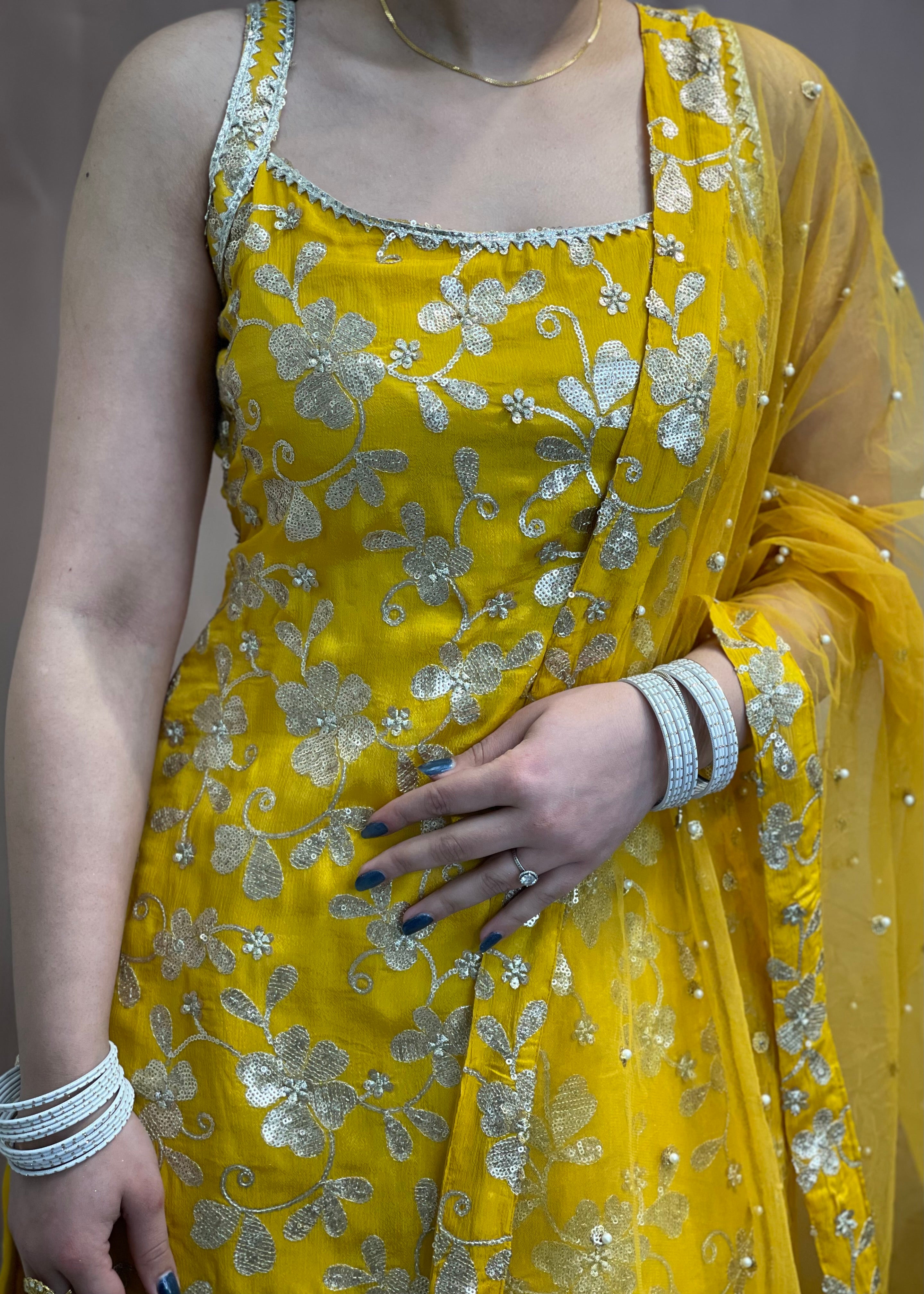 Dazzle in this vibrant yellow crepe sharara set. Featuring intricate sipi work and an elegant sleeveless silhouette, this ensemble perfectly balances traditional craftsmanship with modern style. The lightweight fabric ensures effortless movement for any celebration. • Fabric: Premium Crepe • Detailing: Intricate Sipi Work • Style: Sleeveless • Sizes Available:...