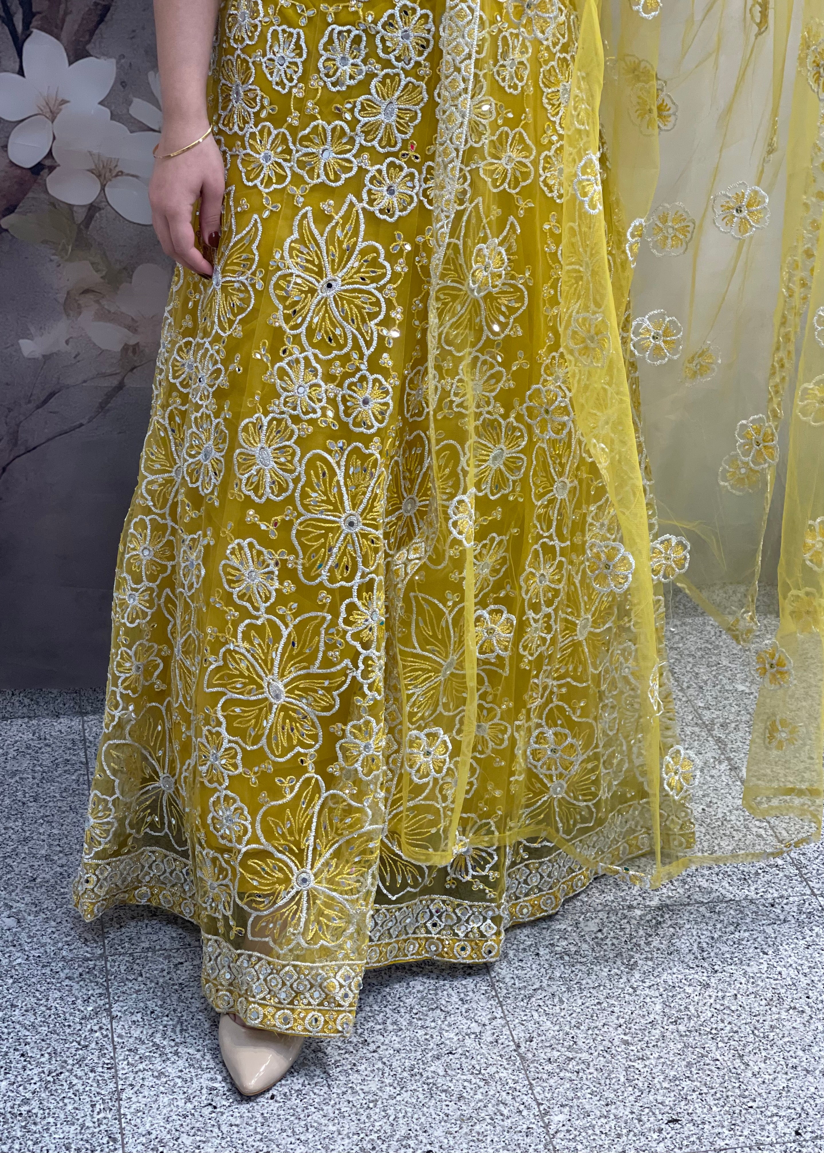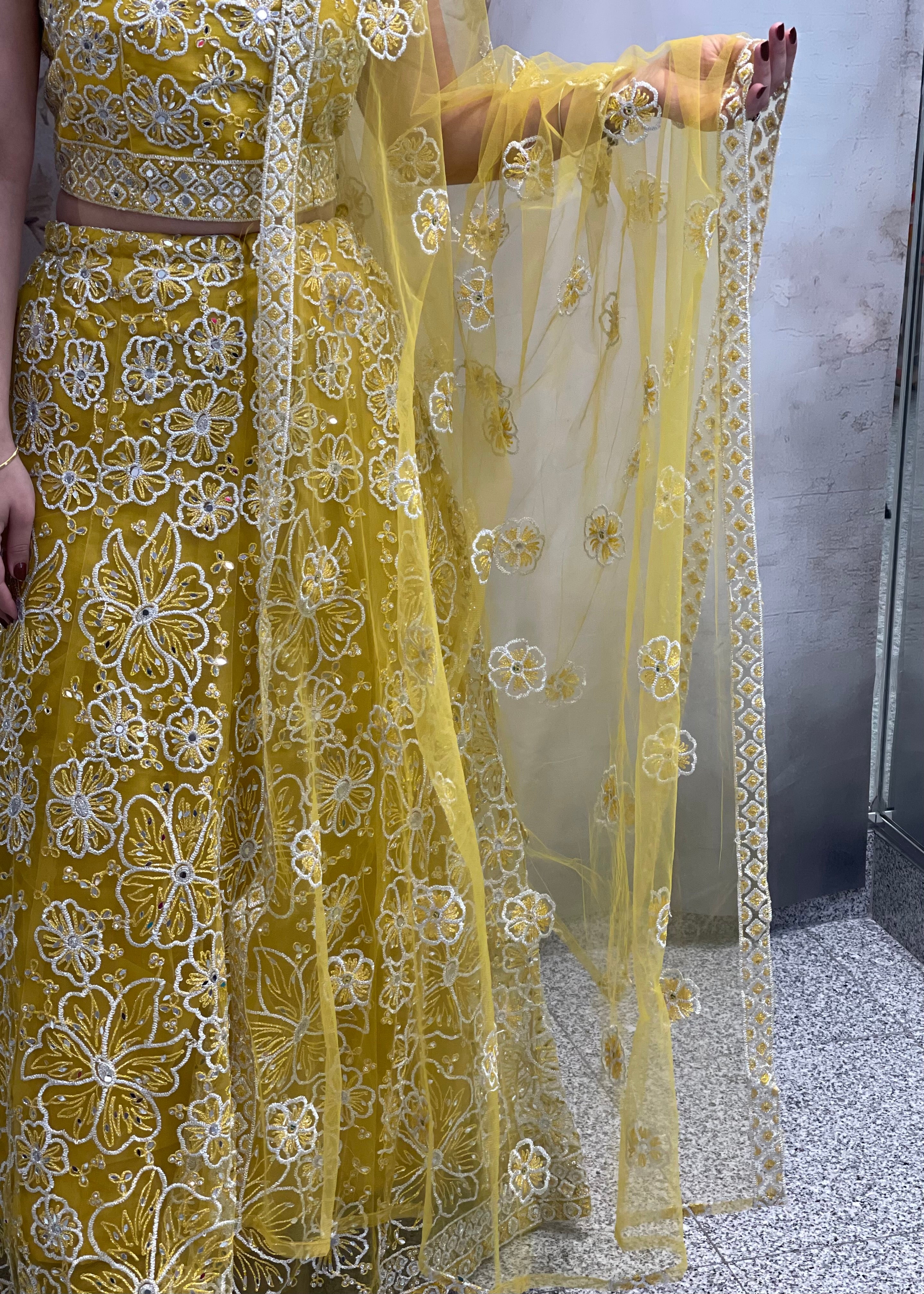 Designer lehnga in yellow color with white threadwork on all over the top and lehnga and this lehnga comes with net lace dupatta.
