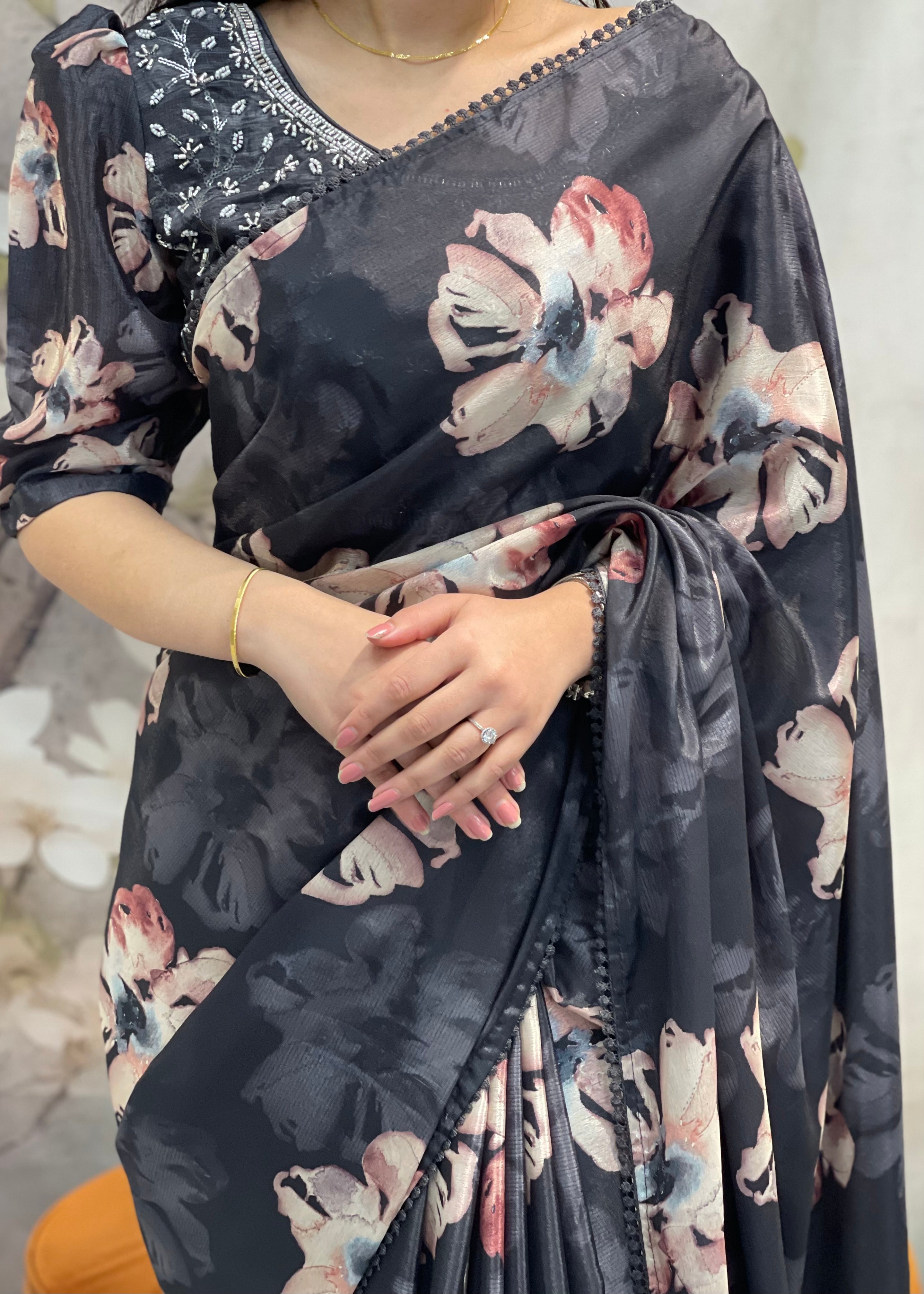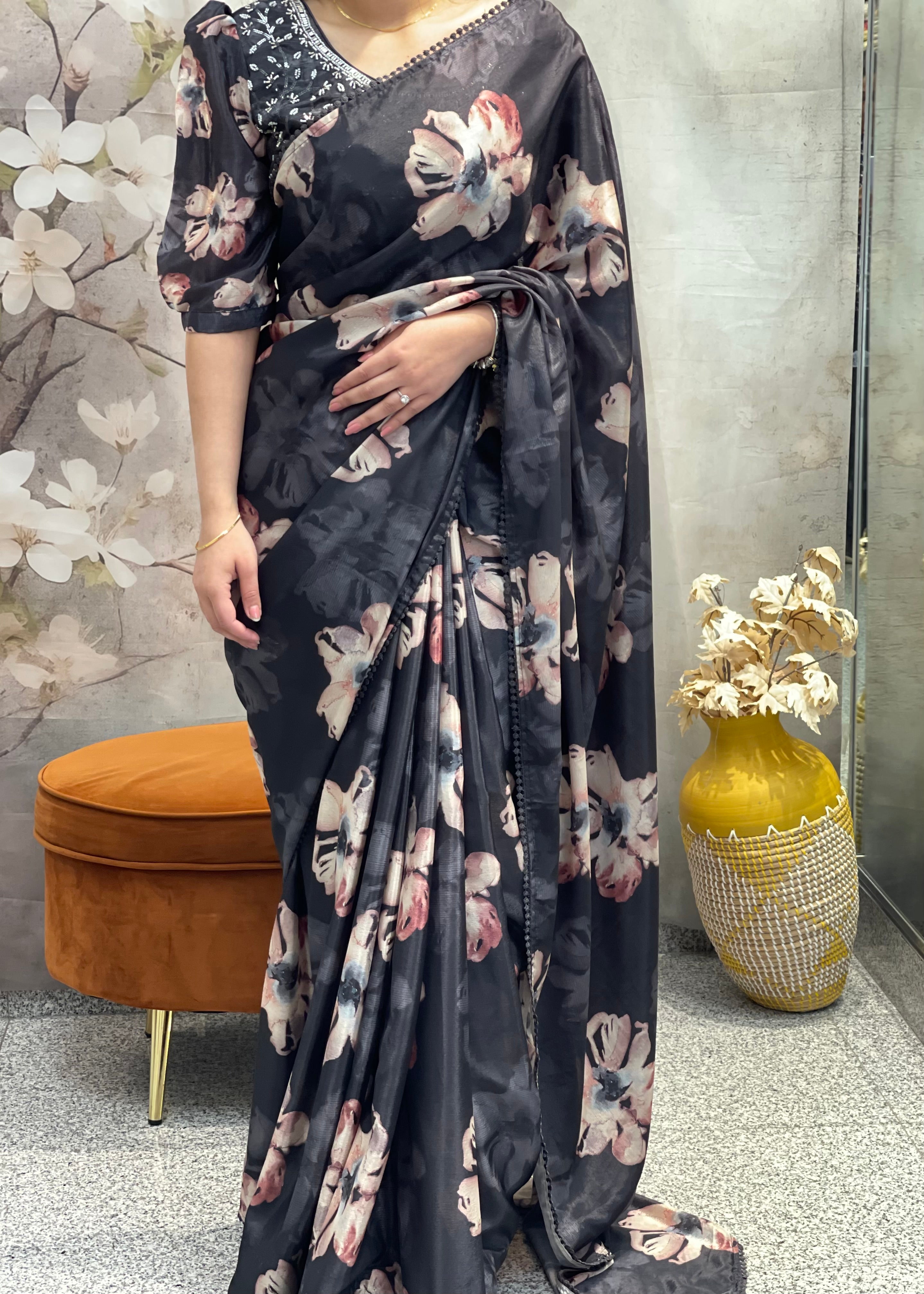 Designer Saree in black color worh floral work print and blouse in size medium with pearl work on it .