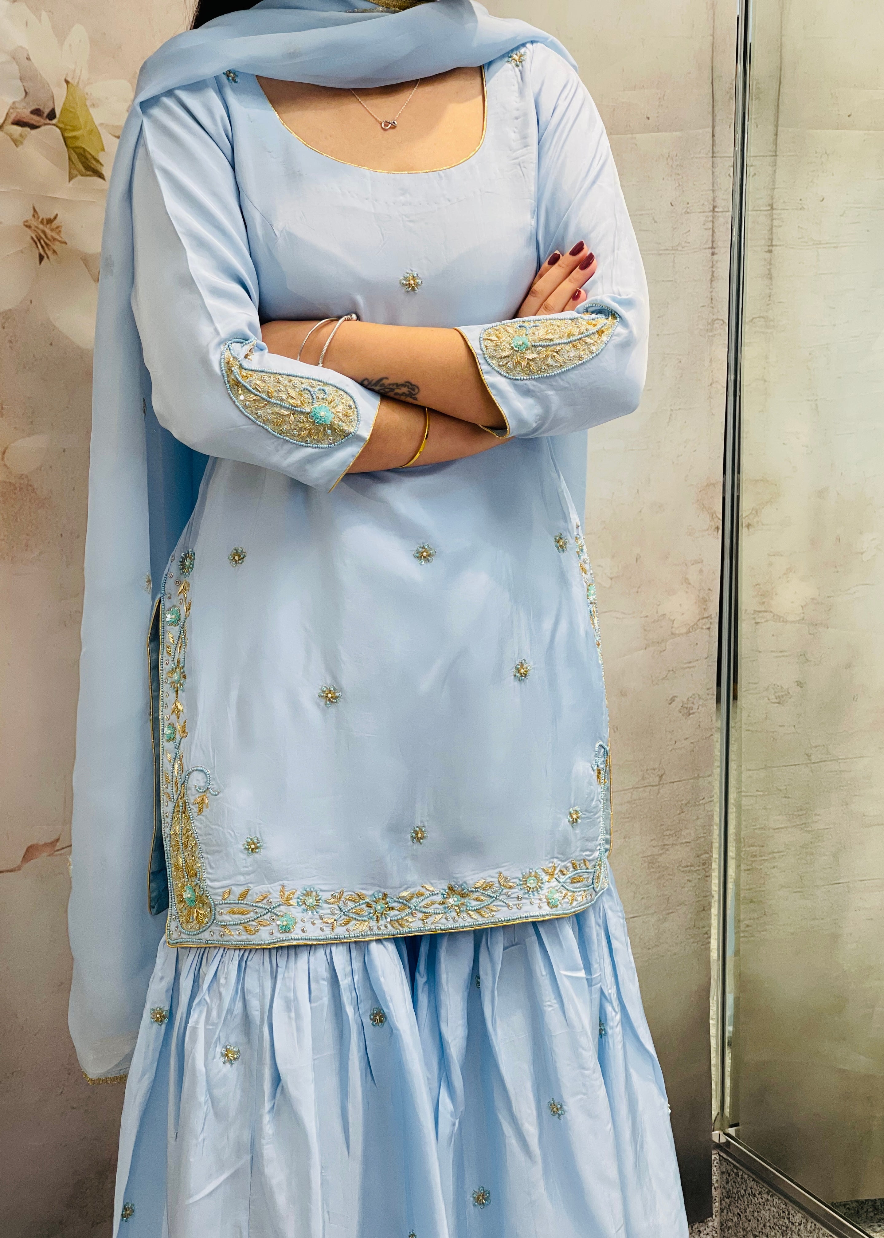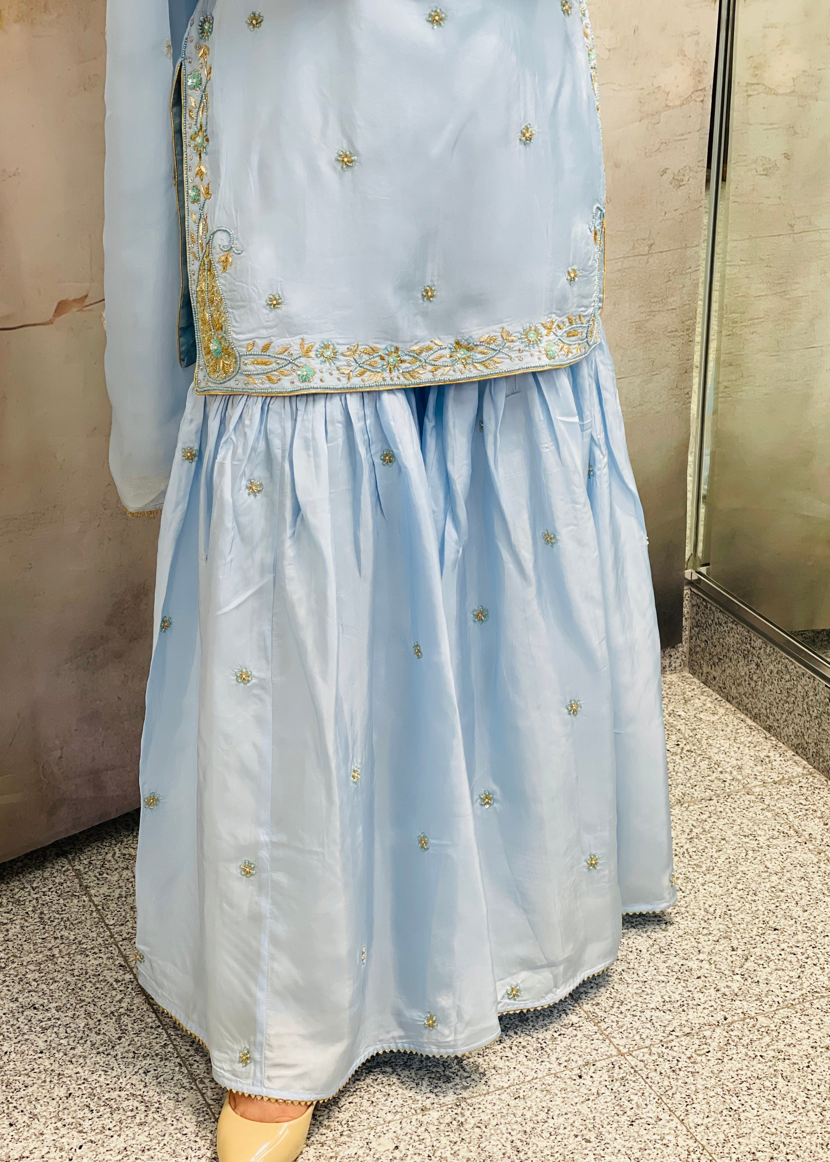 Sharara suit in silk fabric in light blue color with hand work on shirt bottom and dupatta.