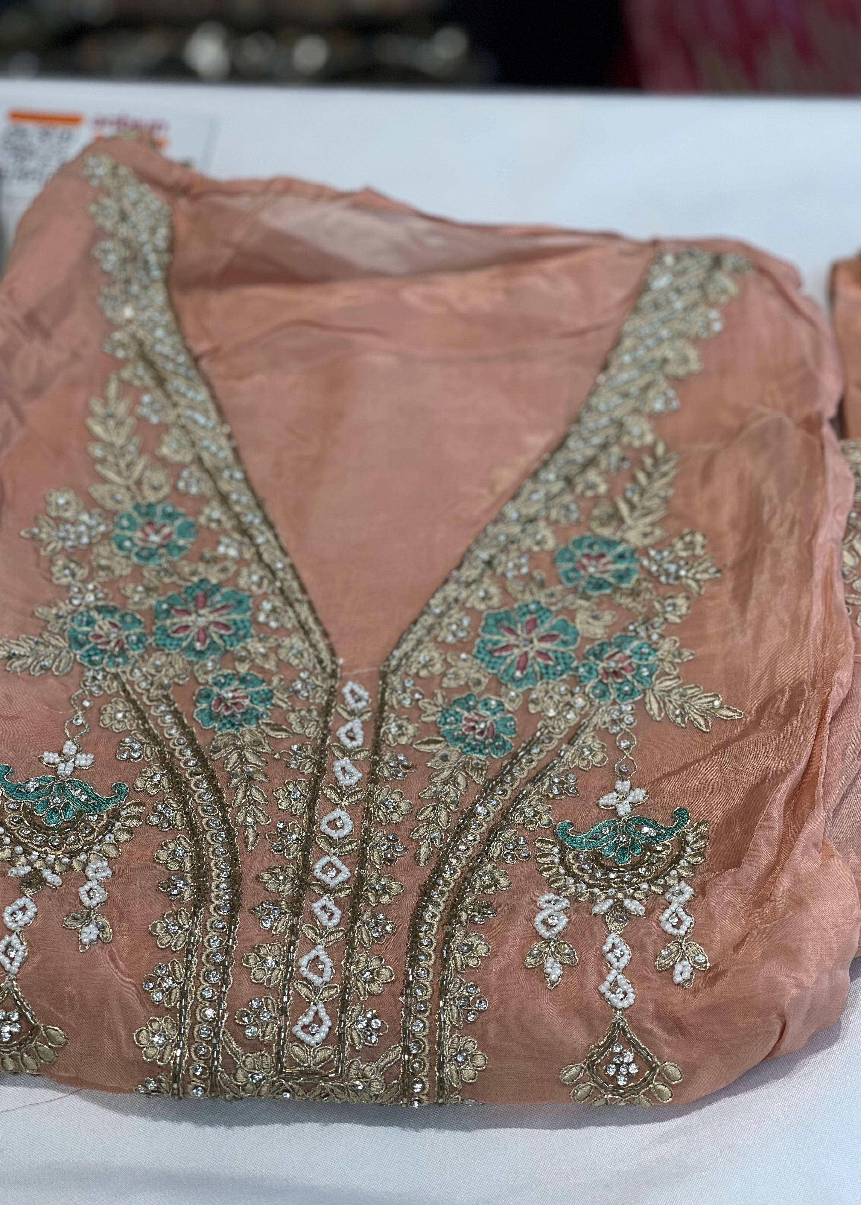 Designer unstitched suit in semi-silk fabric. This suit has embroidery on neck , plain bottom and banarasi dupatta.
