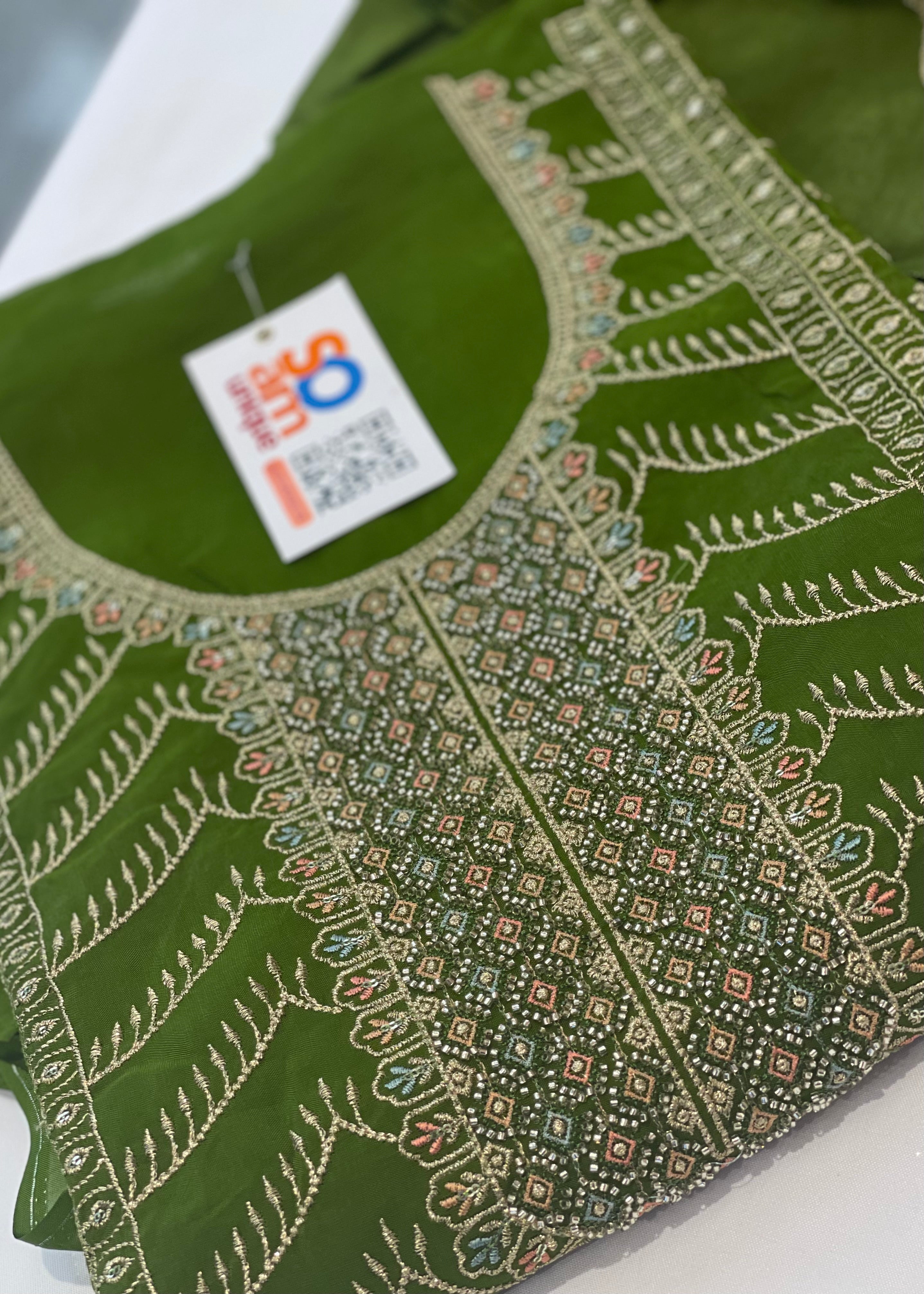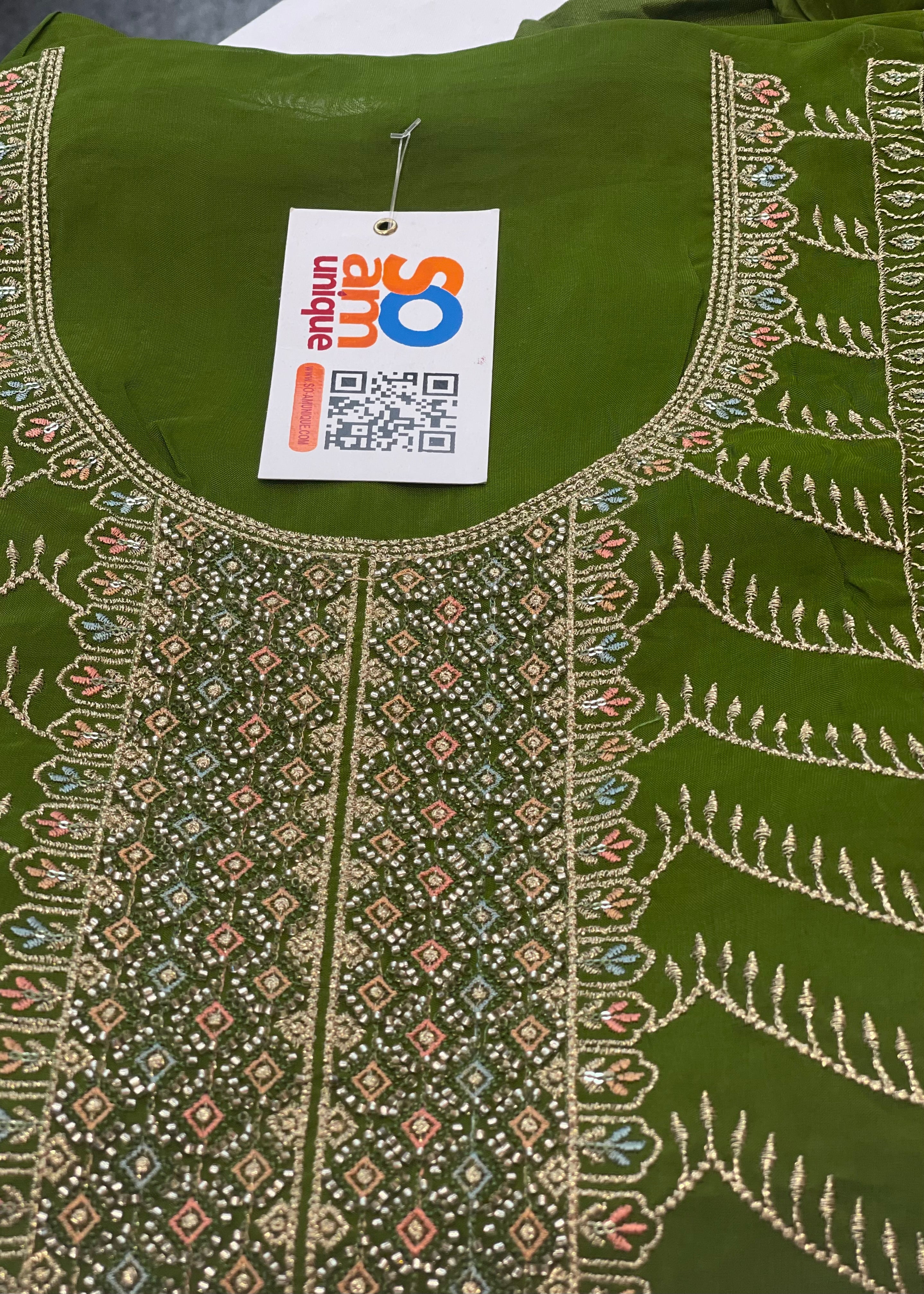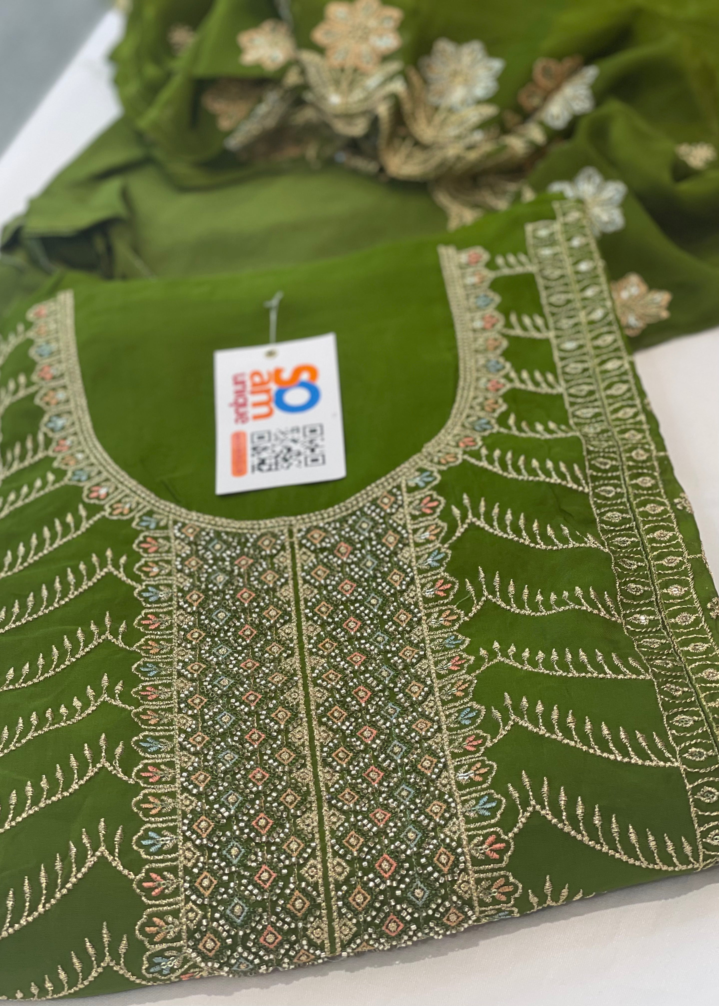 Unstitched Suit in mehndi green color with fully threadwork embroidery on shirt and dupatta and plain bottom.