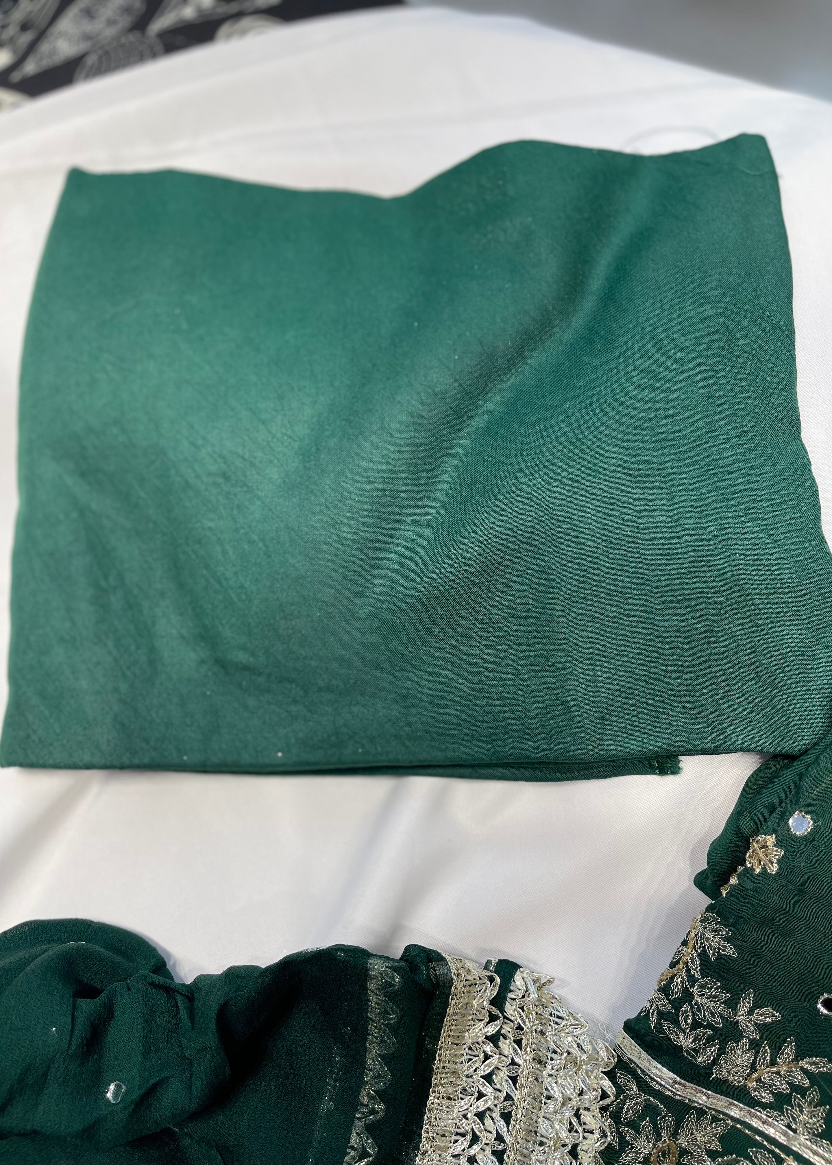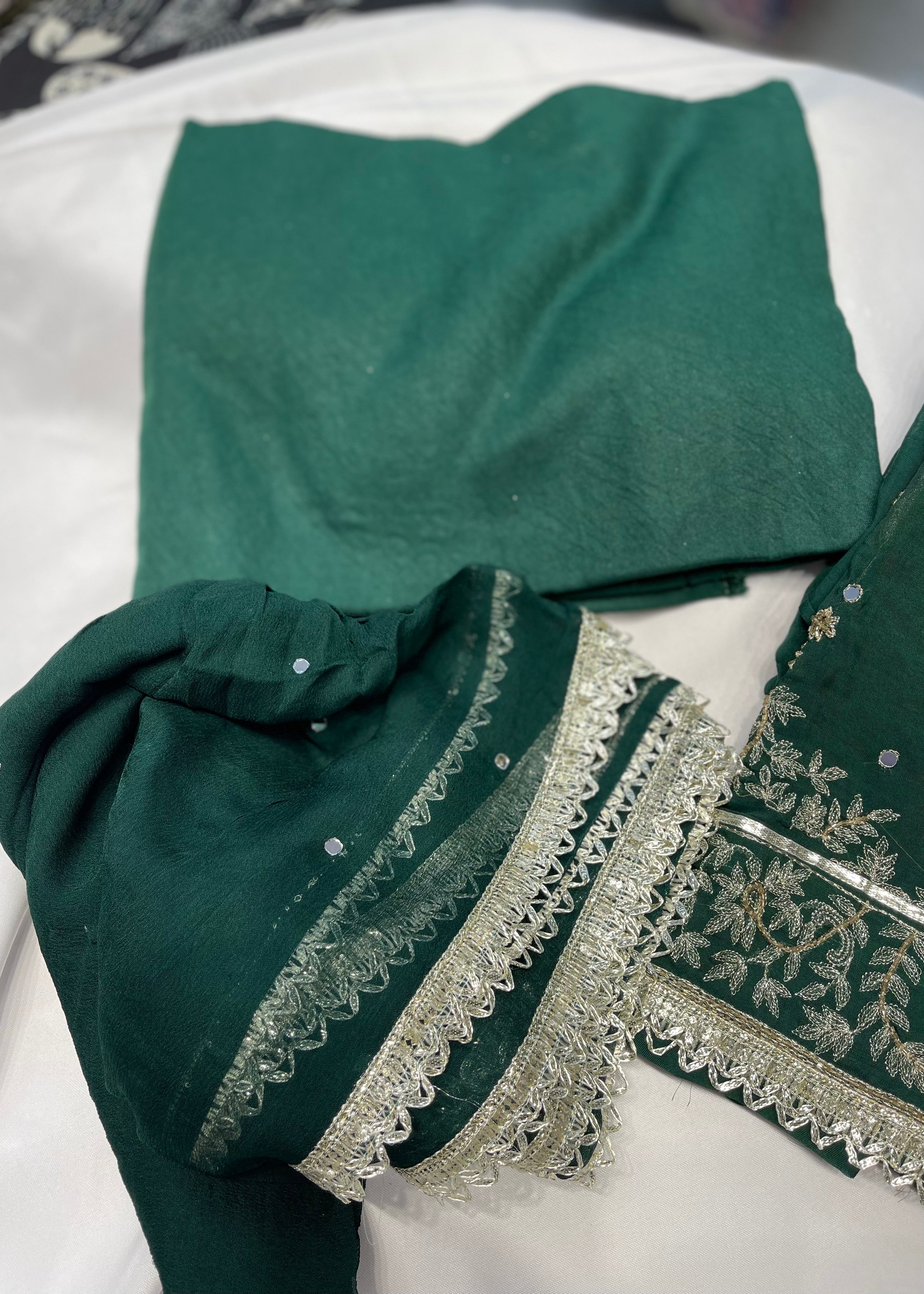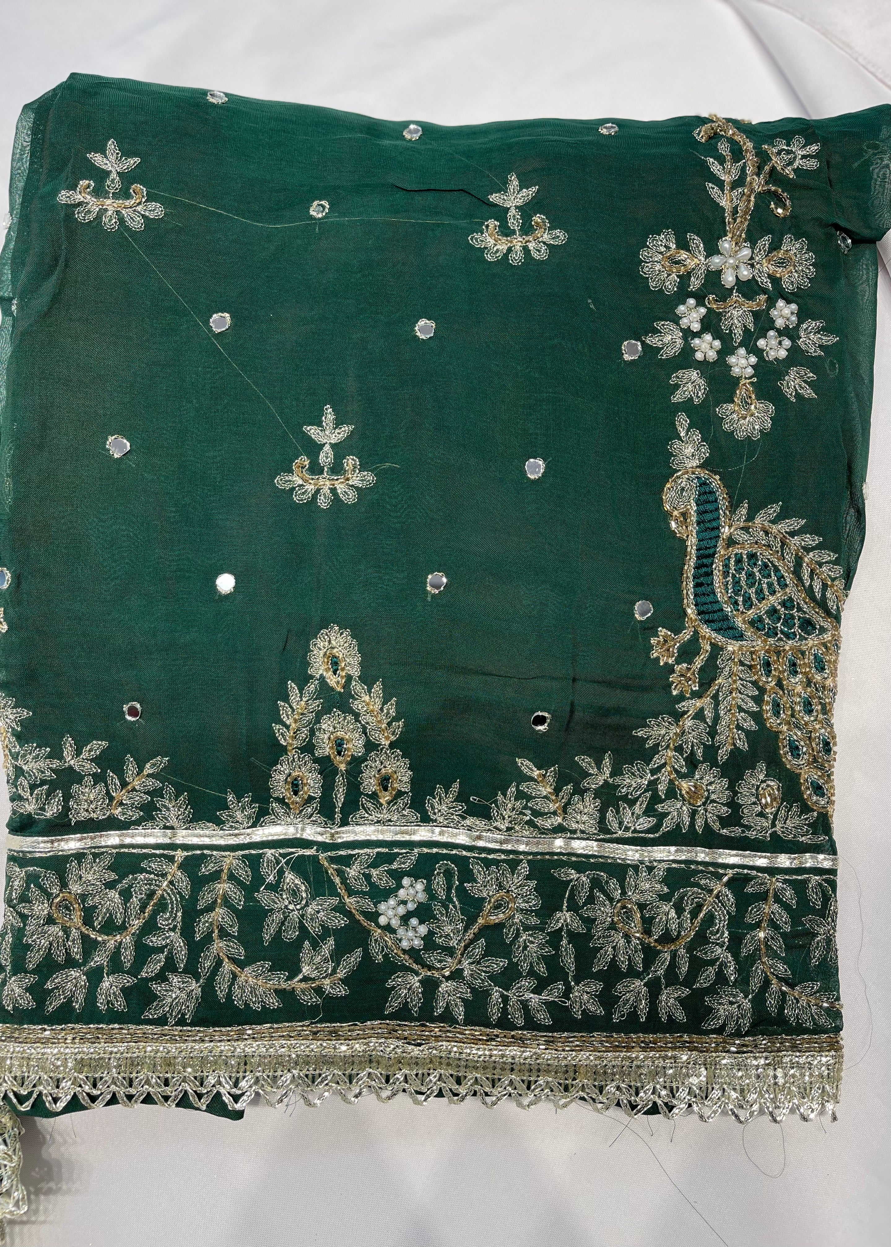 Designer unstitched suit in peacock pattern embroidery on shirt and gotta work design on dupatta.