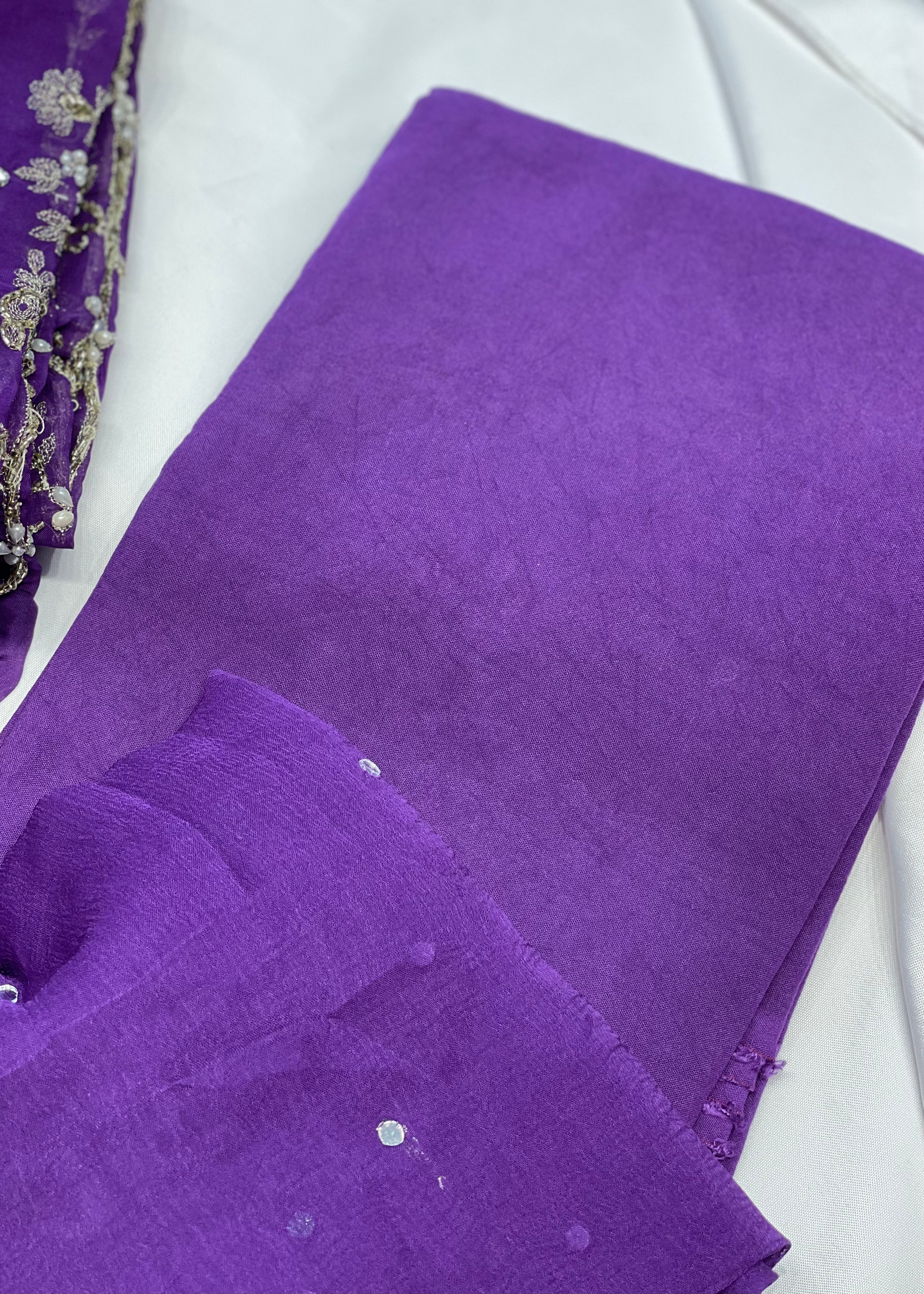 Designer Unstitched suit in deep purple or jamuni shade with threadwork on shirt in peacock pattern.