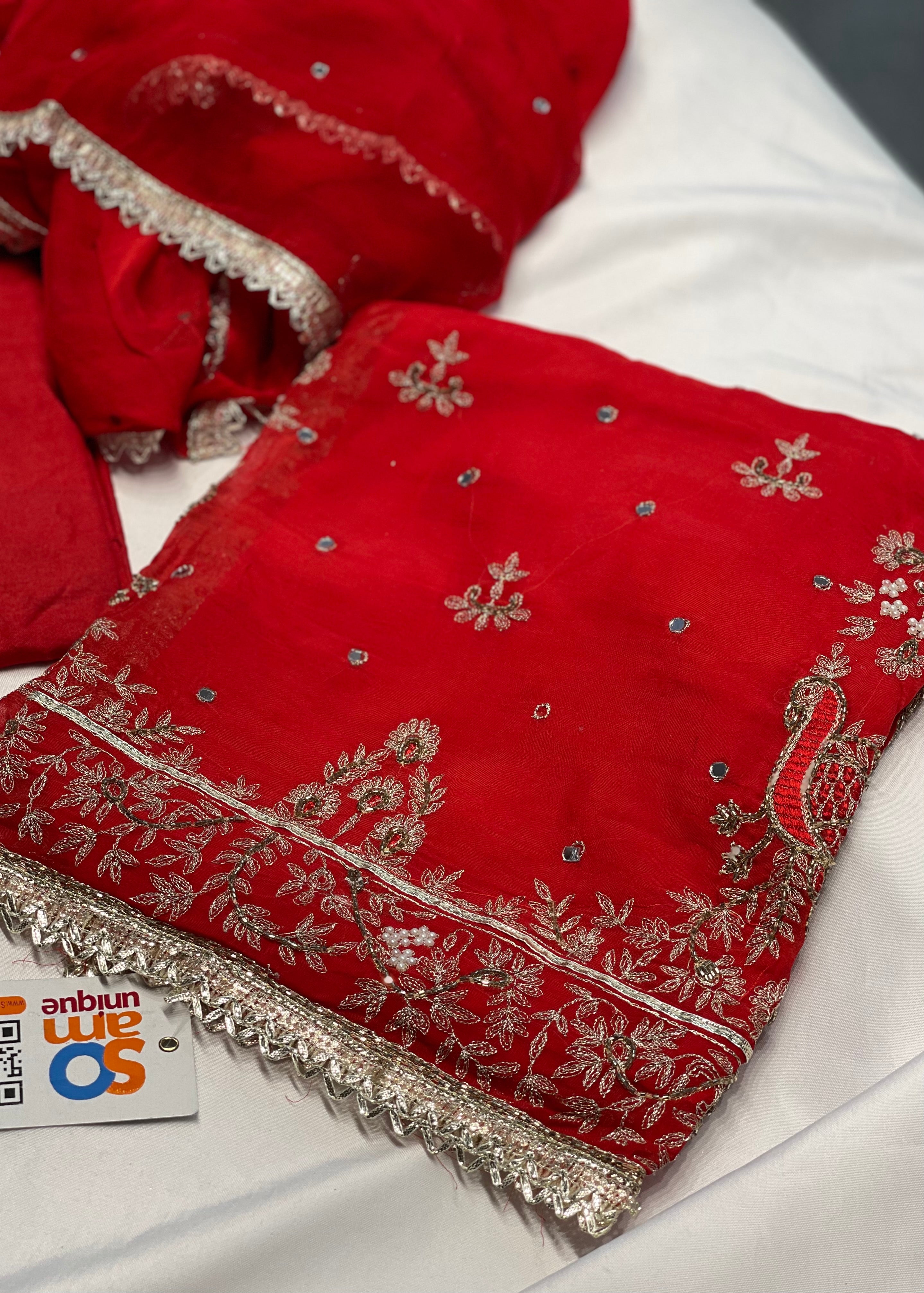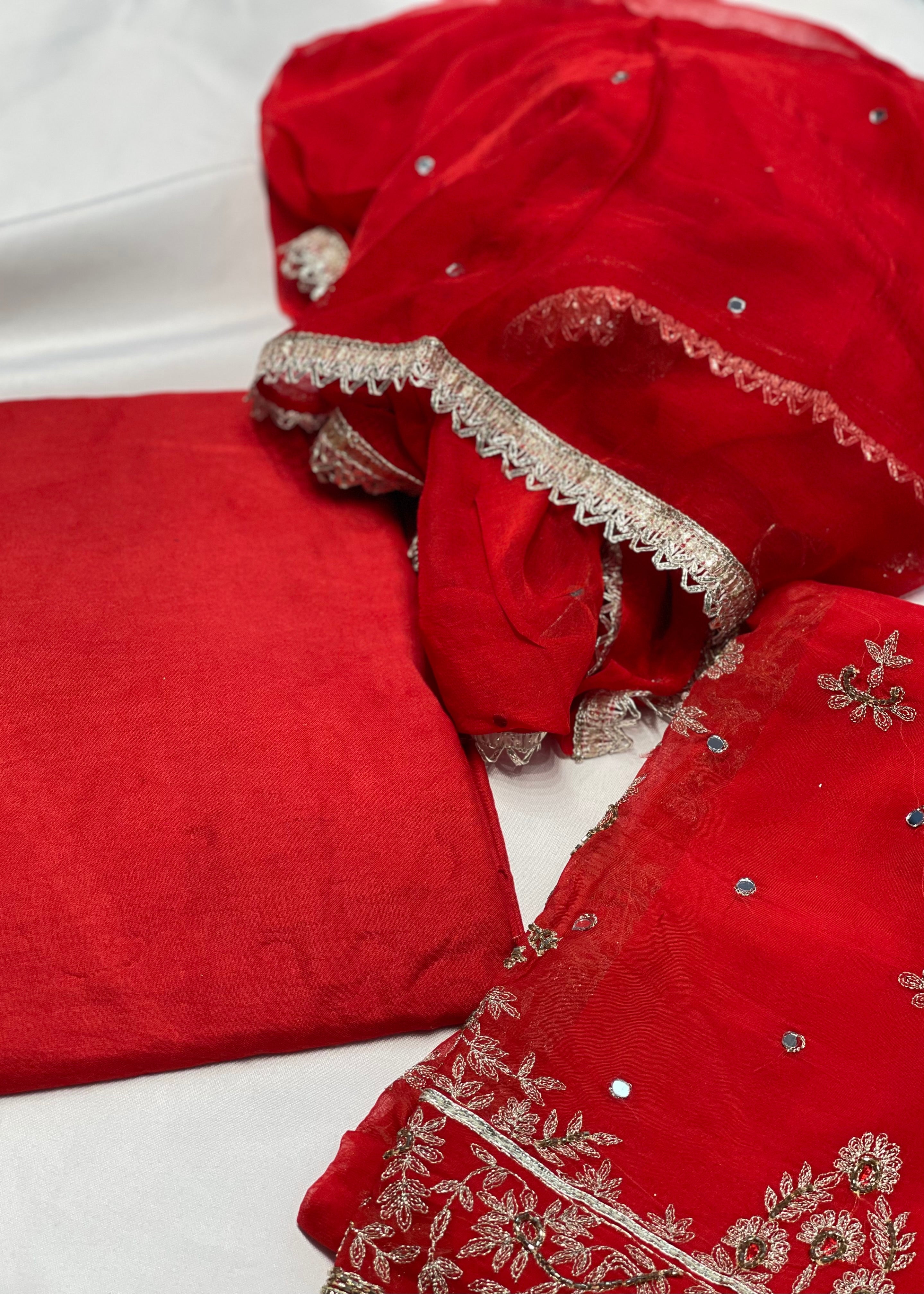 Designer unstitched suit in red color with peacock pattern embroidery on it.