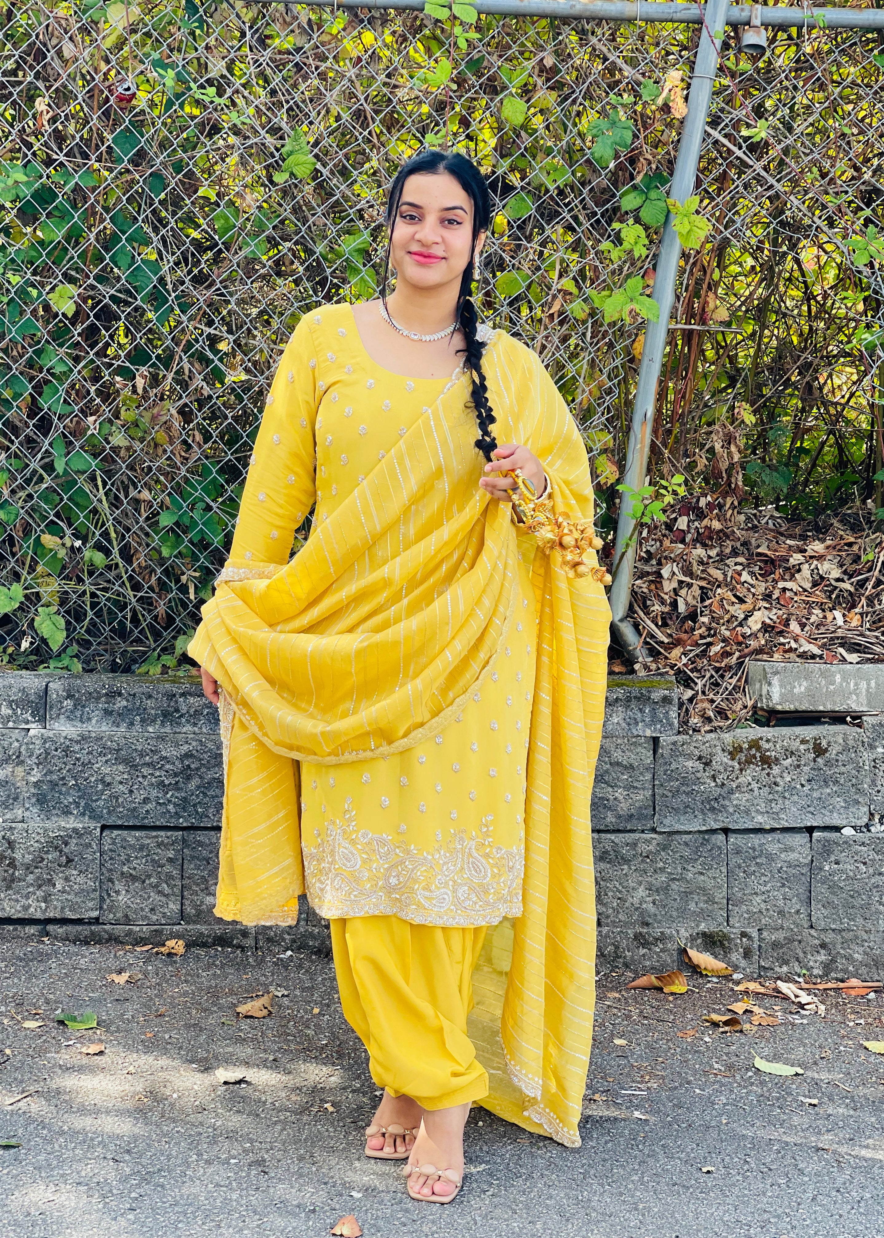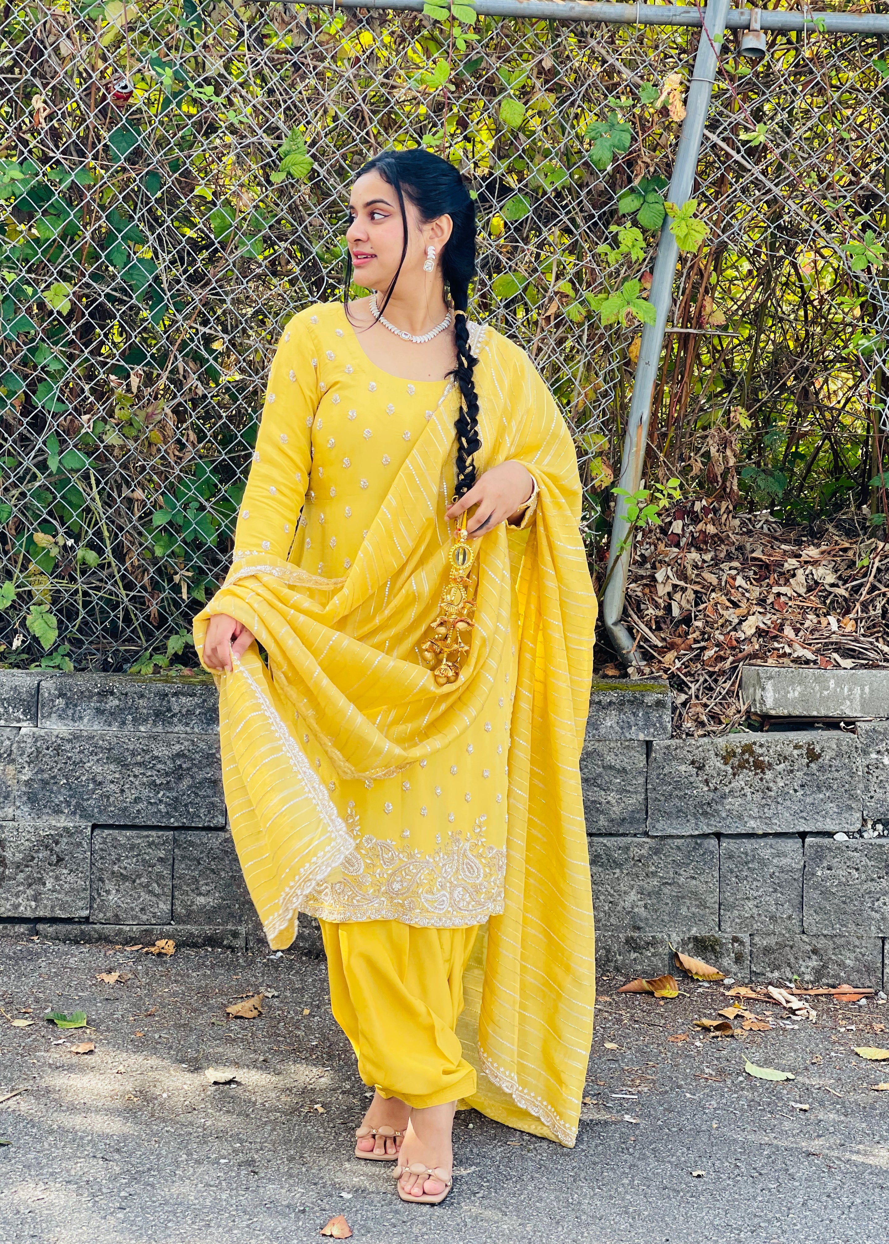 Designer salwar suit in yellow color with hand work on shirt and dupatta in pure fabric.