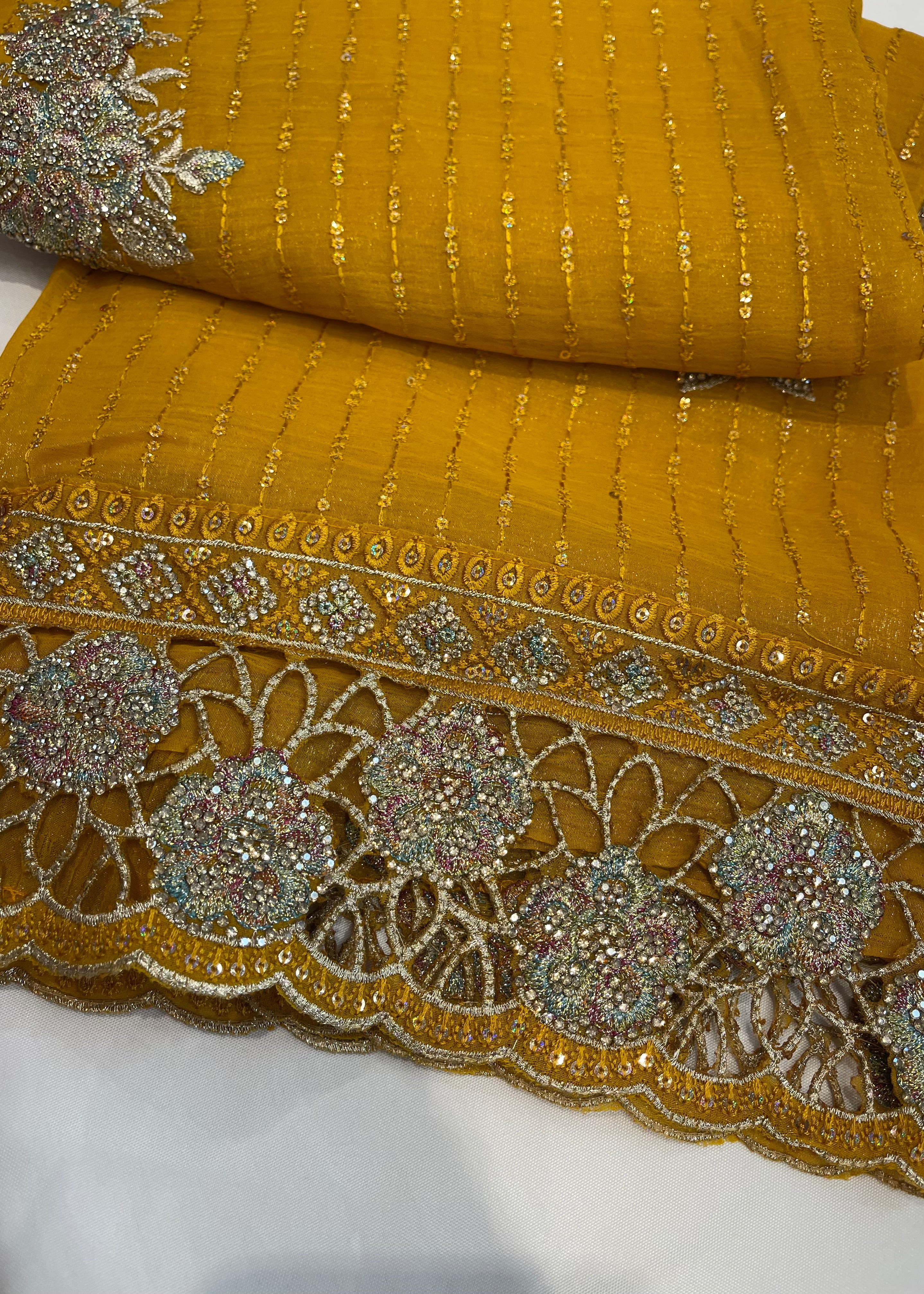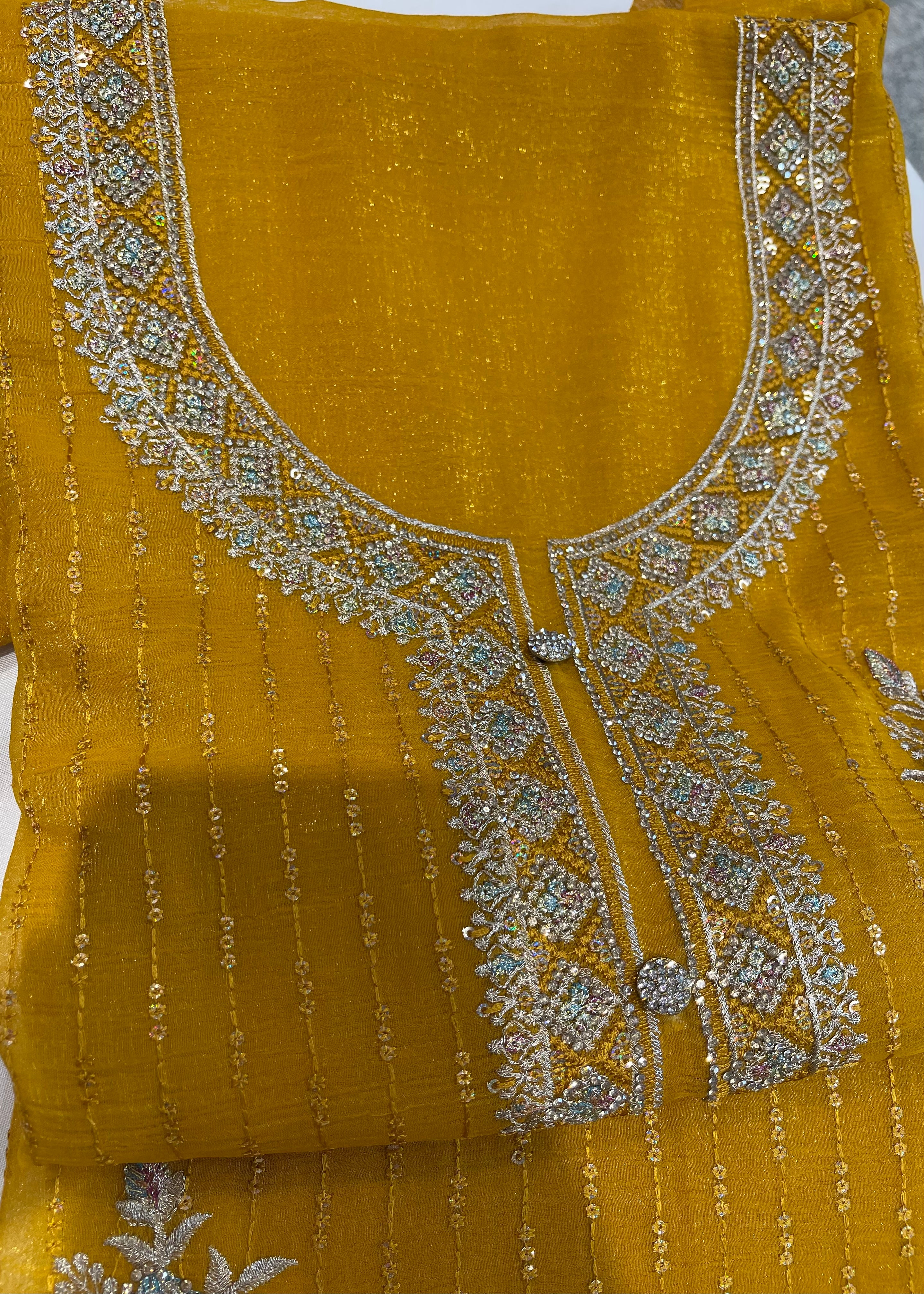 Designer unstitched suit in shimmer fabric with gold embroidery on shirt and dupatta.