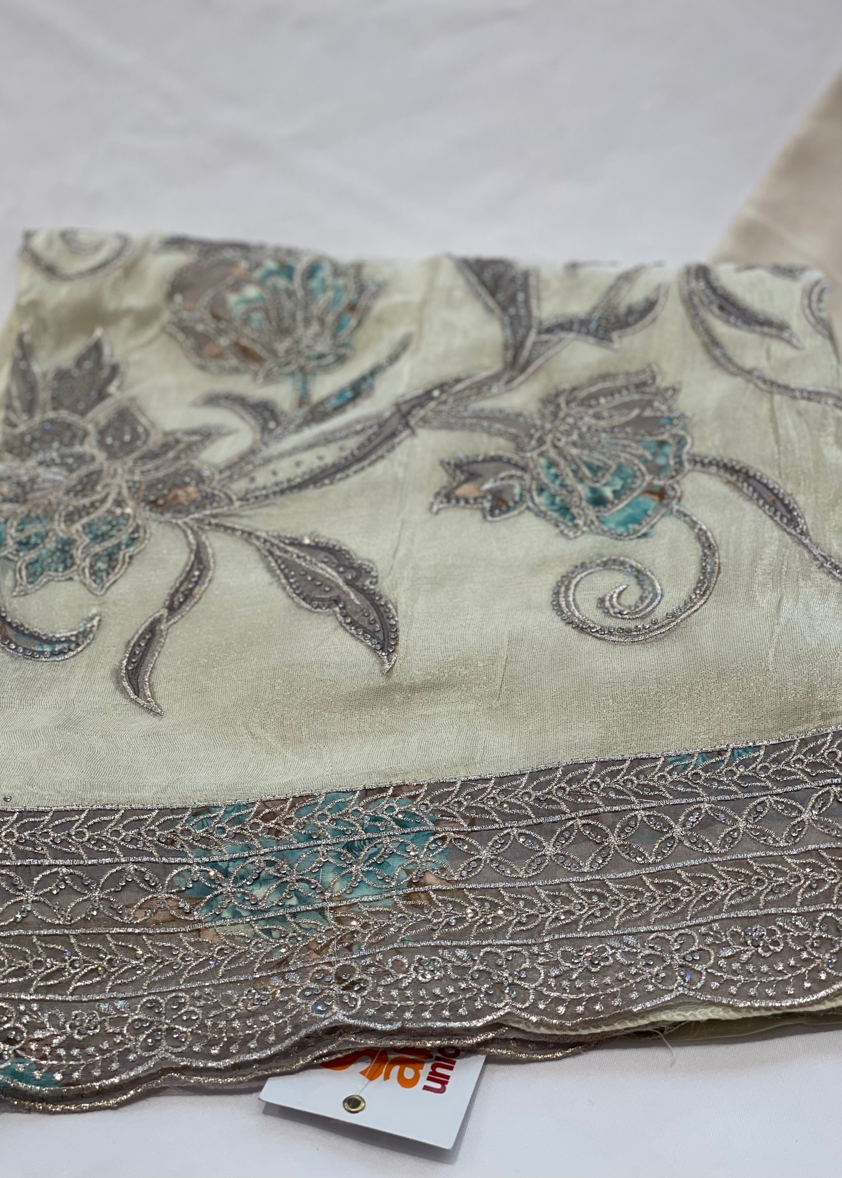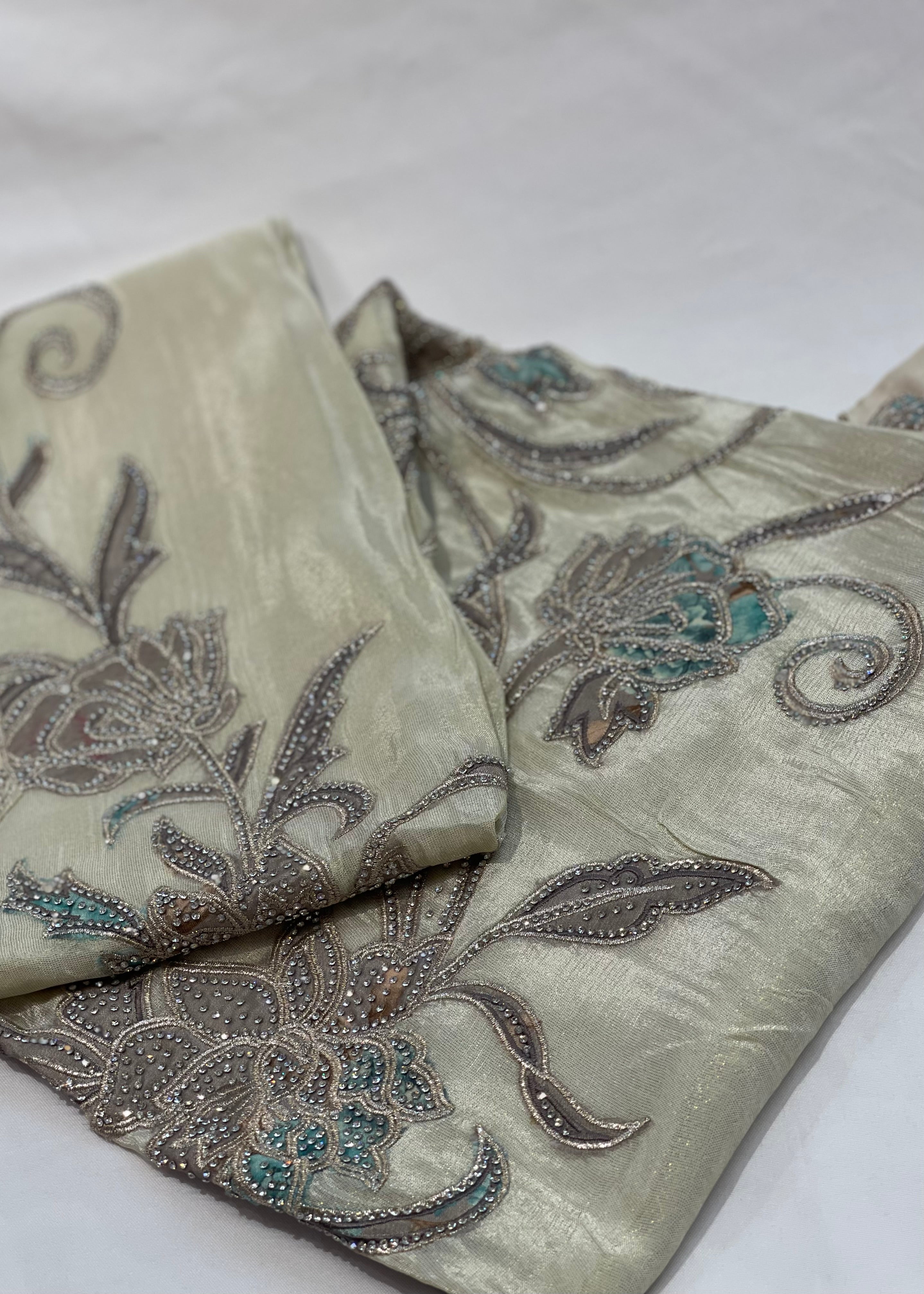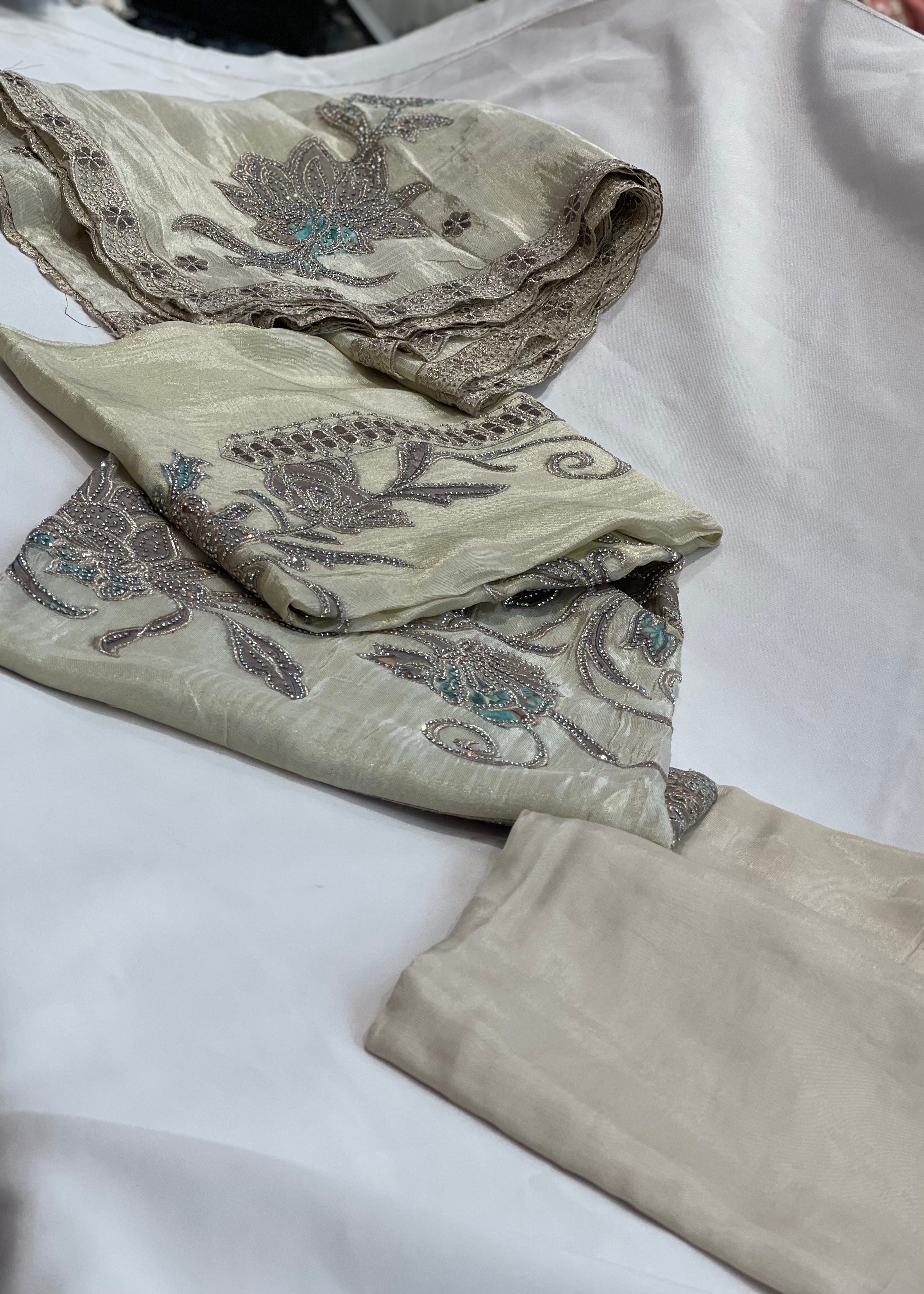Designer unstitched suit in shimmer fabric with embroidery on the shirt and dupatta.