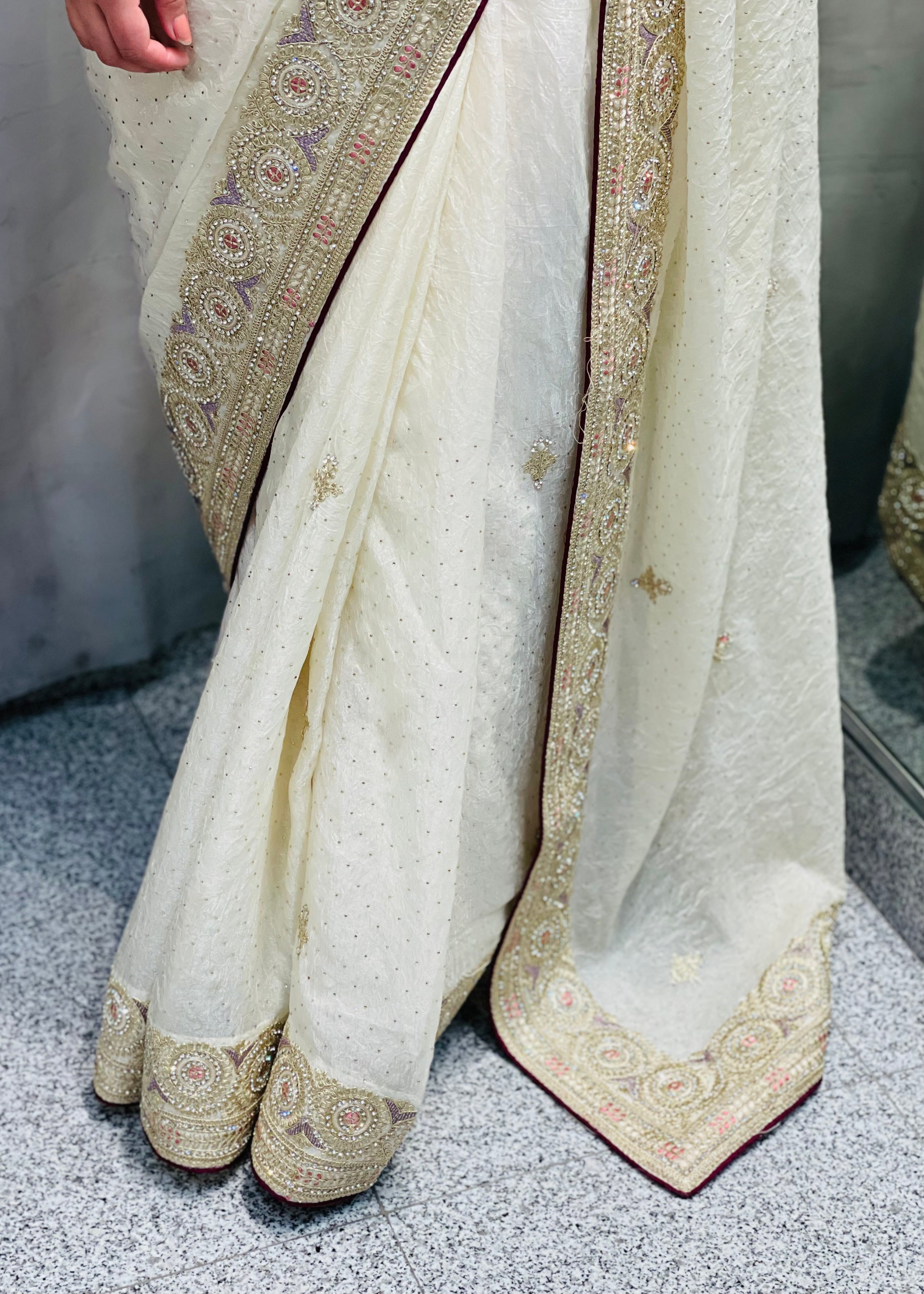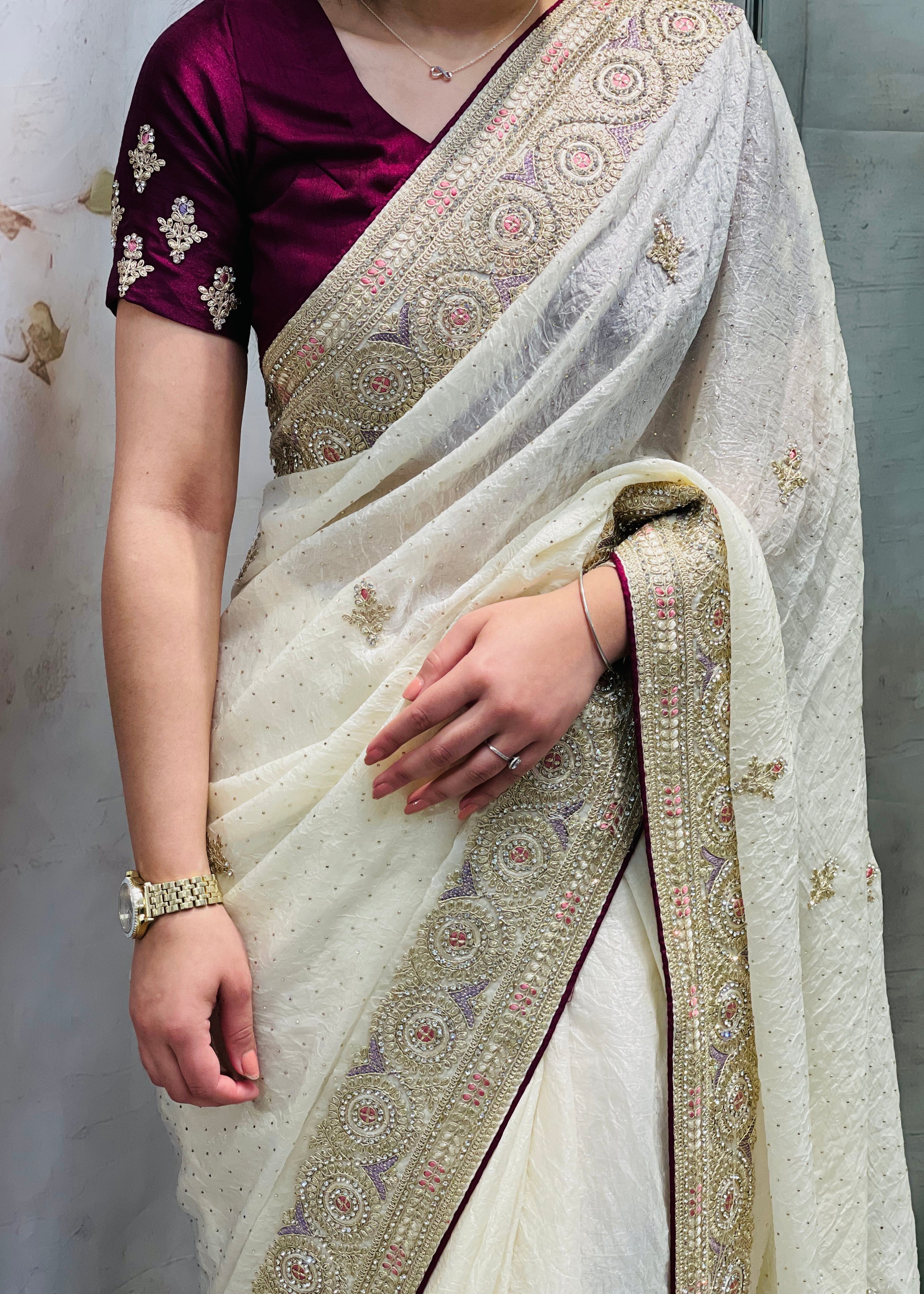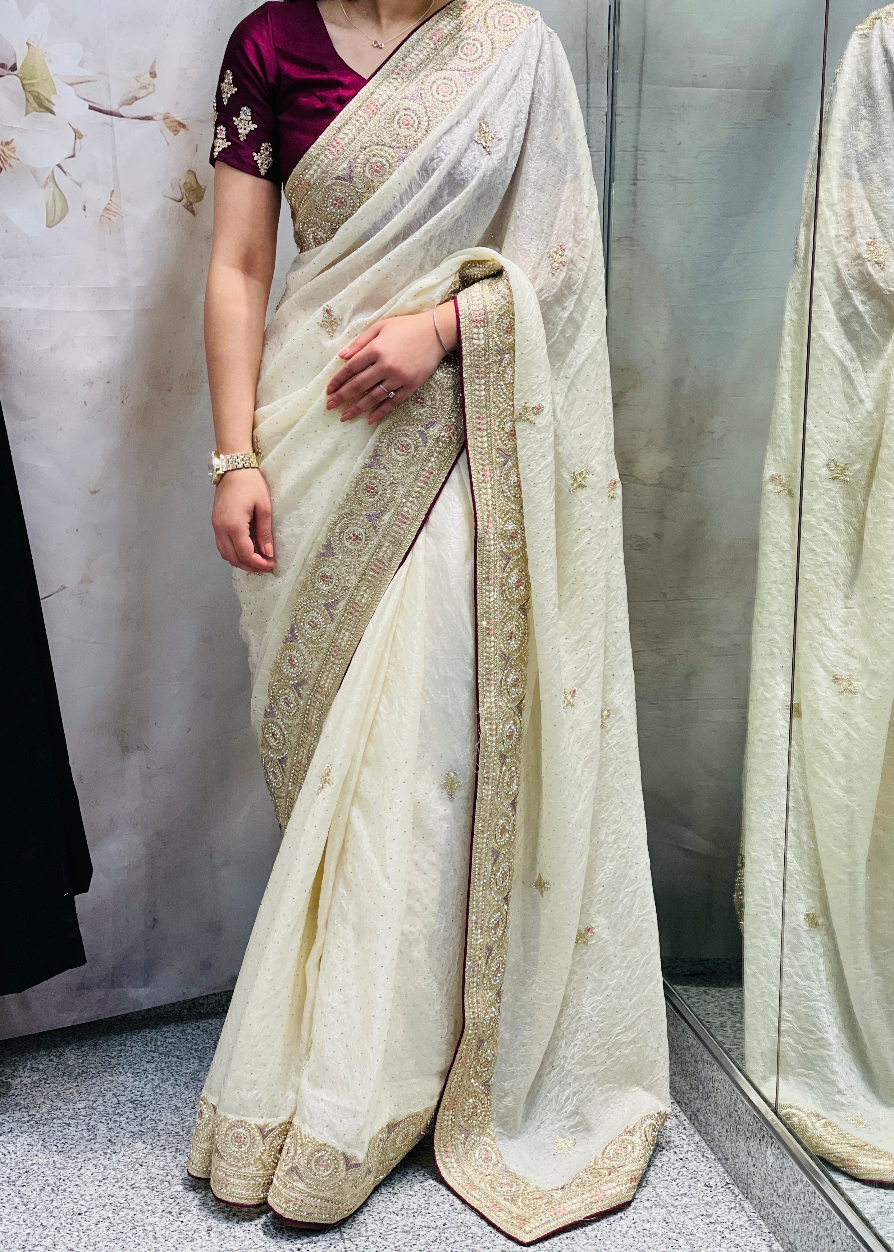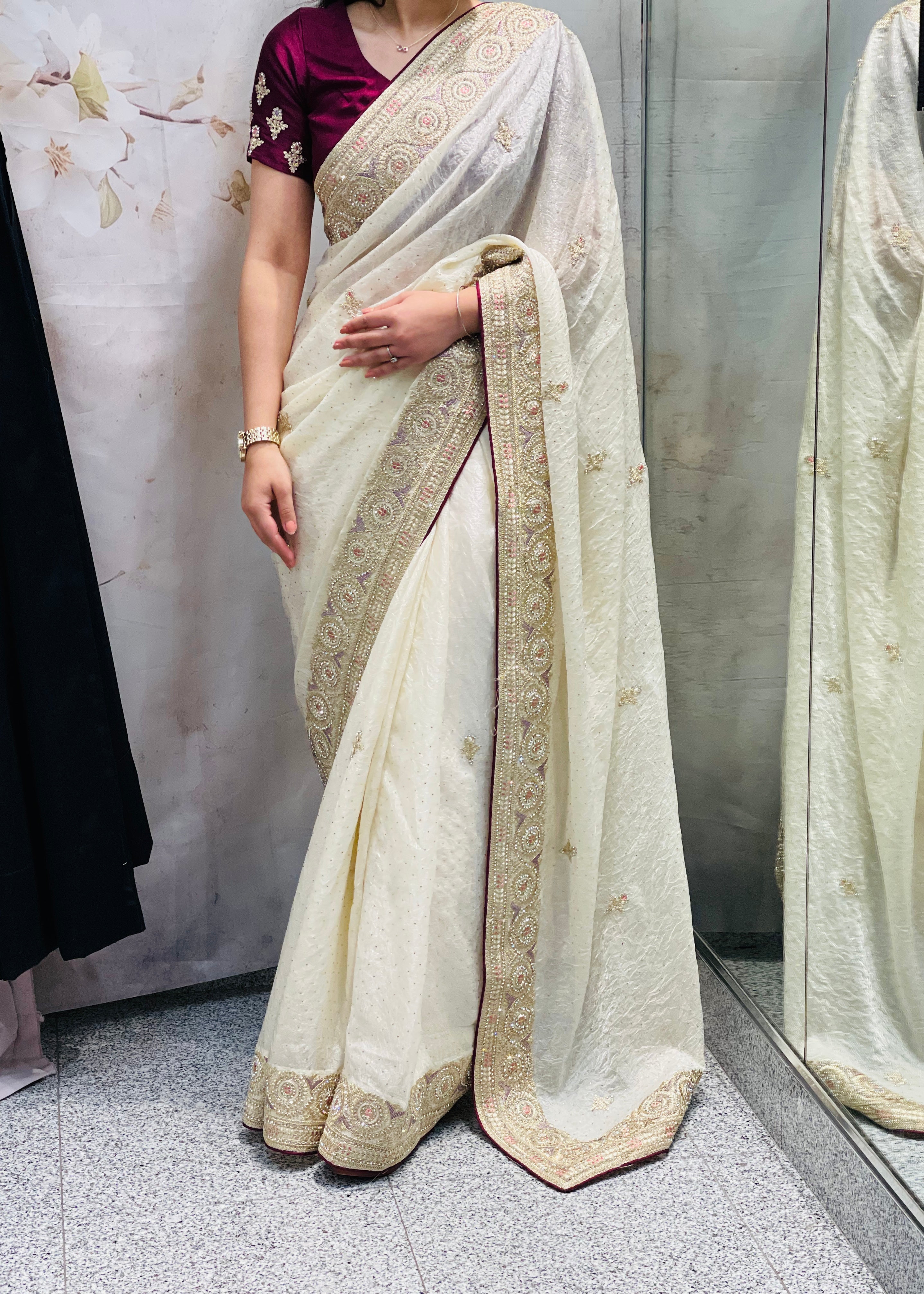 Readymade saree in cream color with a combination blouse with heavy embroidery on it.