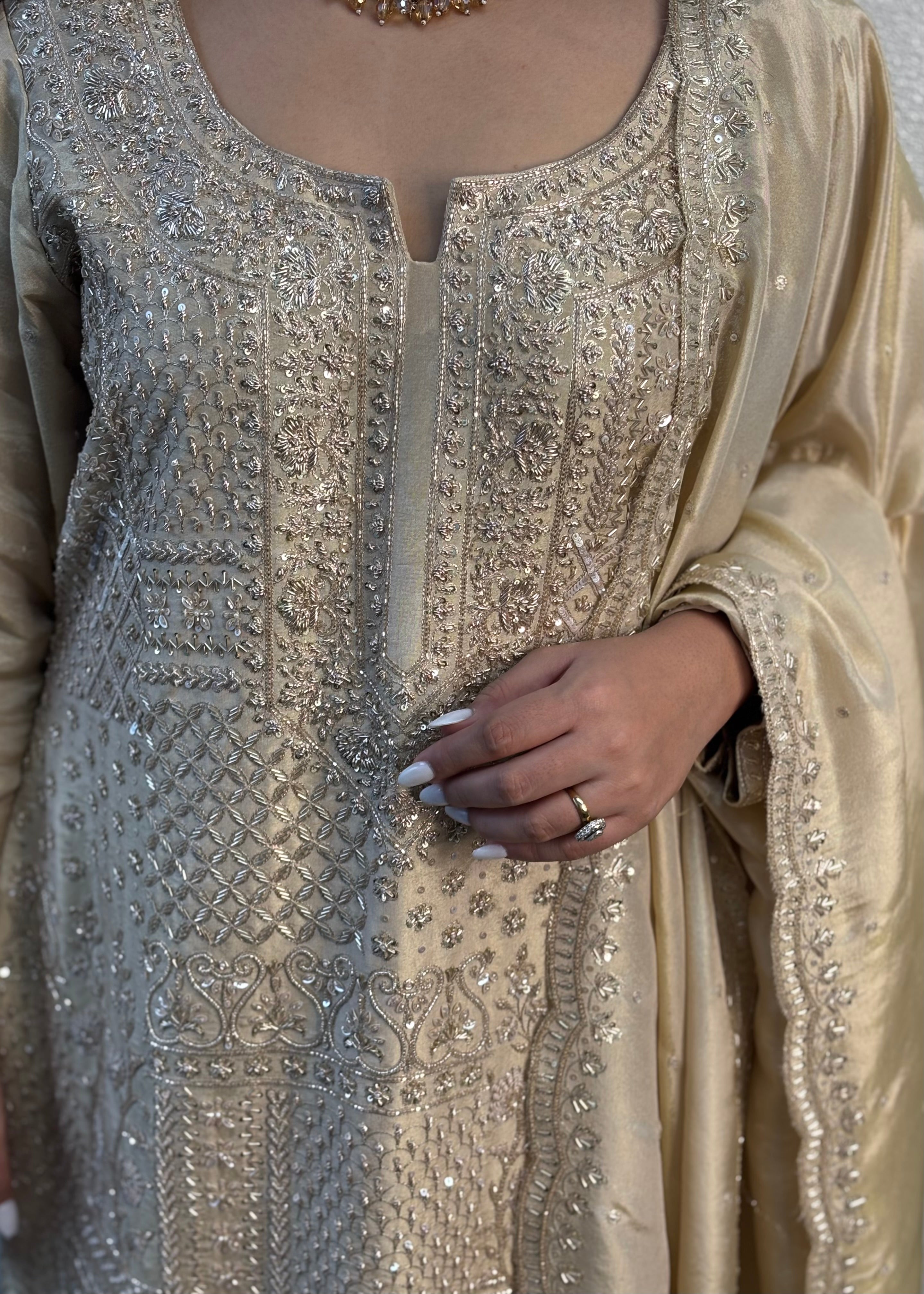 The Craftsmanship: Intricate, hand-worked Sippi, Moti, Nalki, and Dabka work that sparkles from every angle.