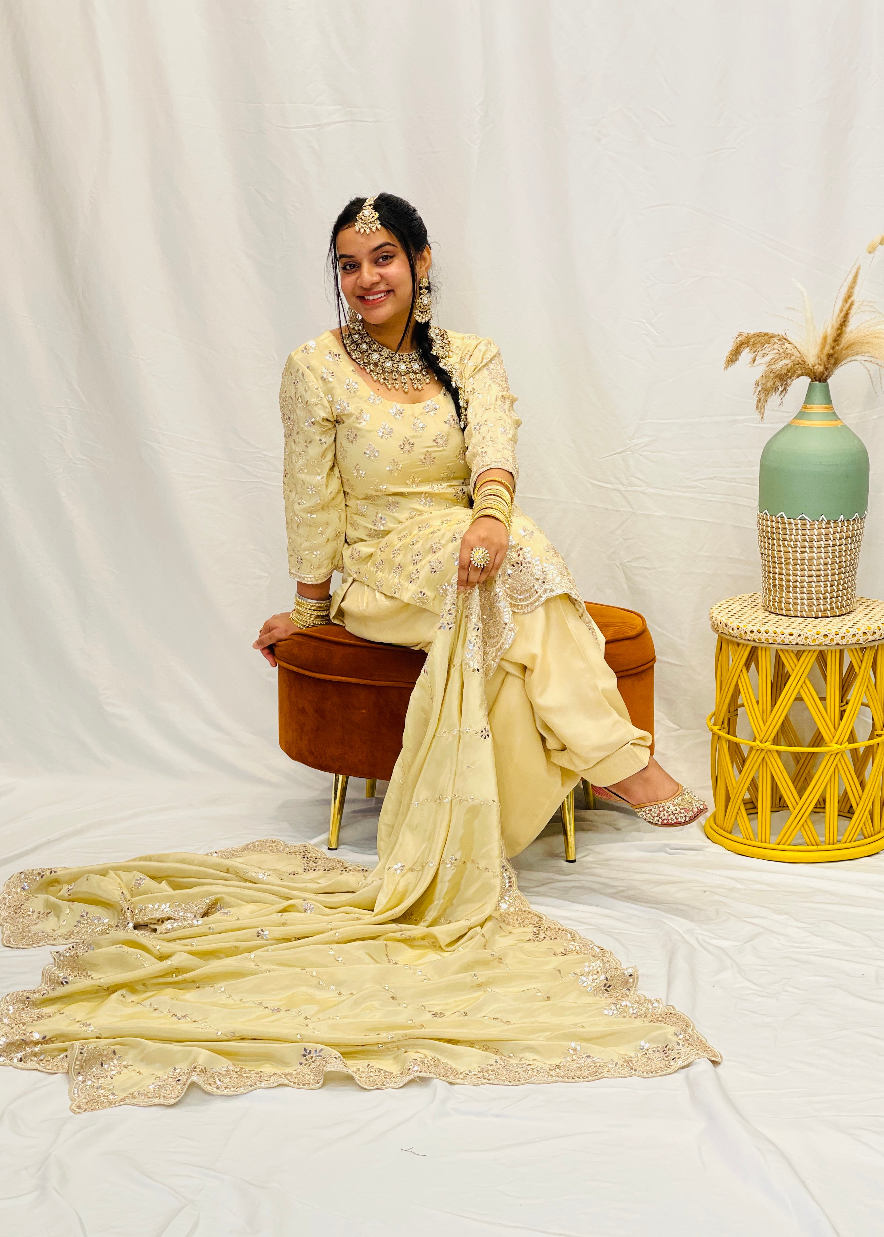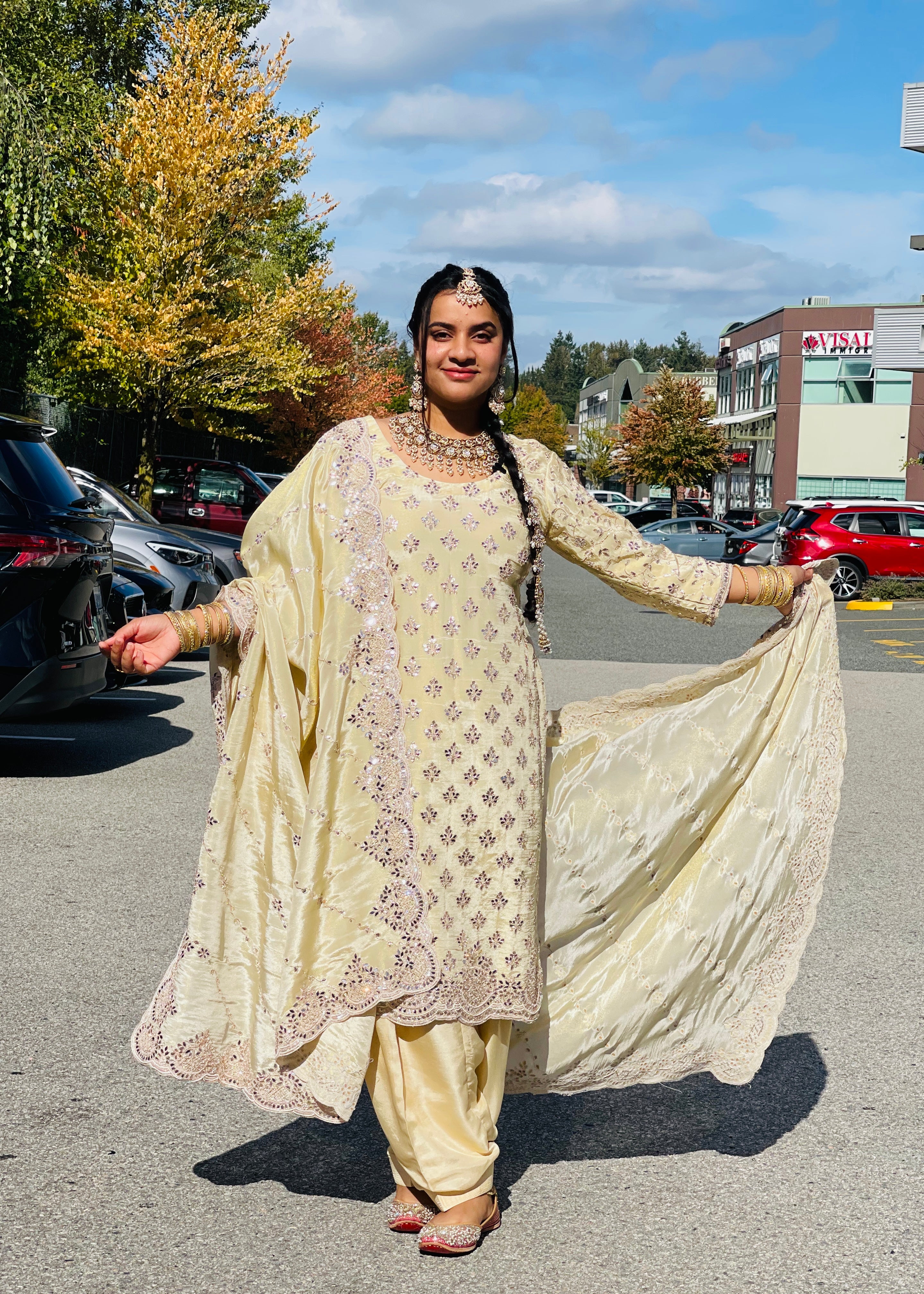Salwar suit in size medium in shimmer fabric with mirrors and gotta patti embroidery on it.