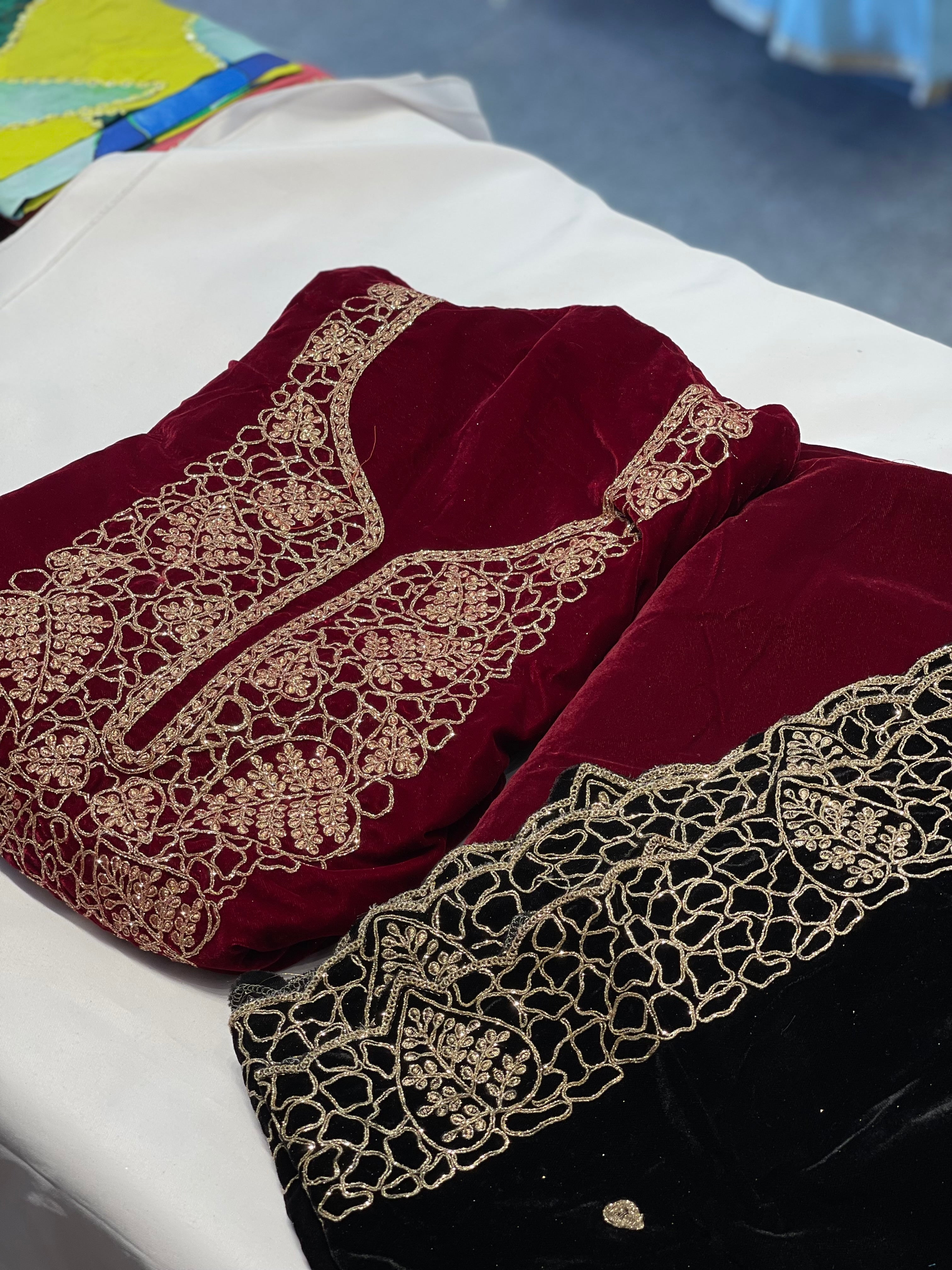 Unstitched suit in velvet fabric in red color with black shawl and embroidery on shirt and shawl.