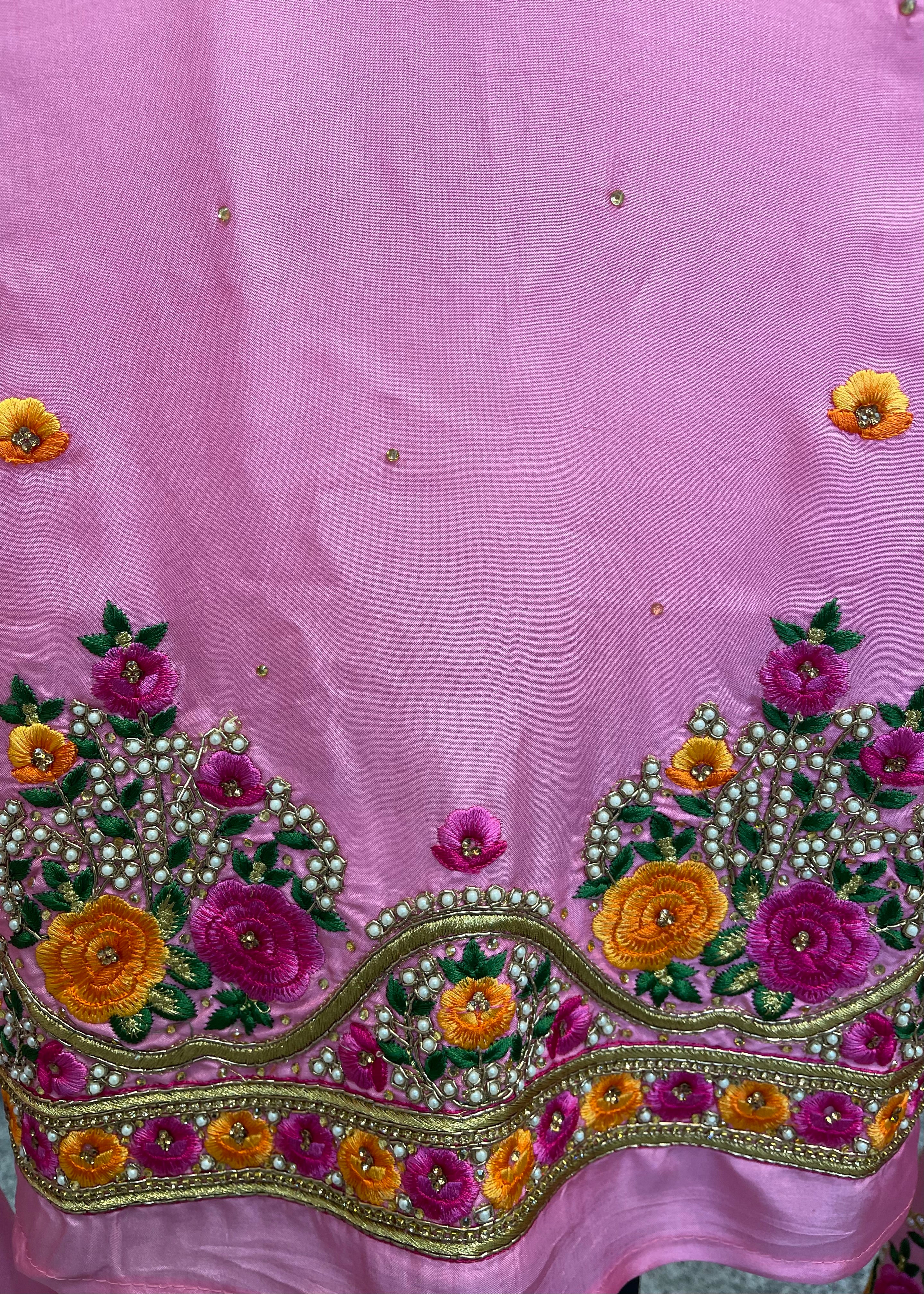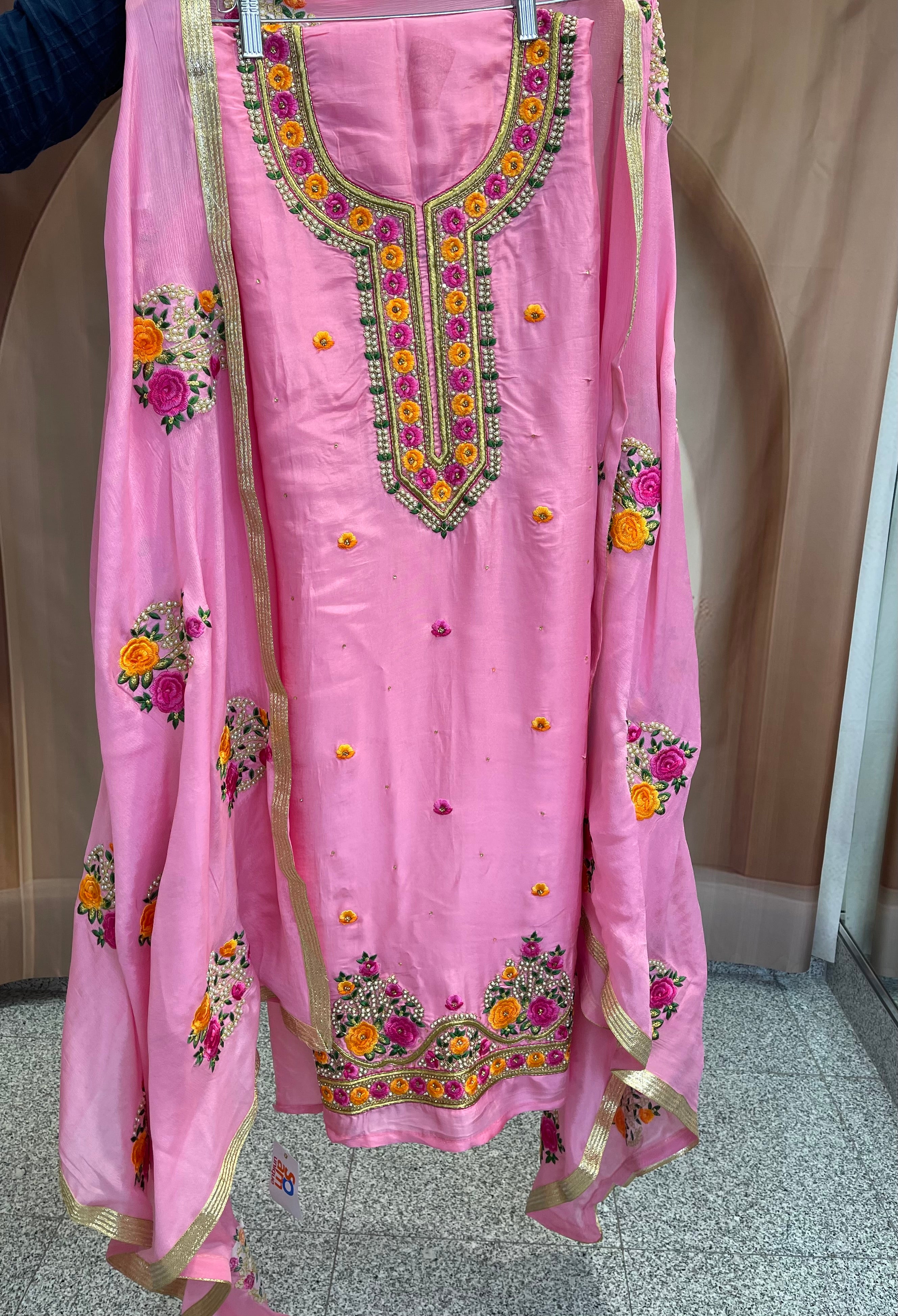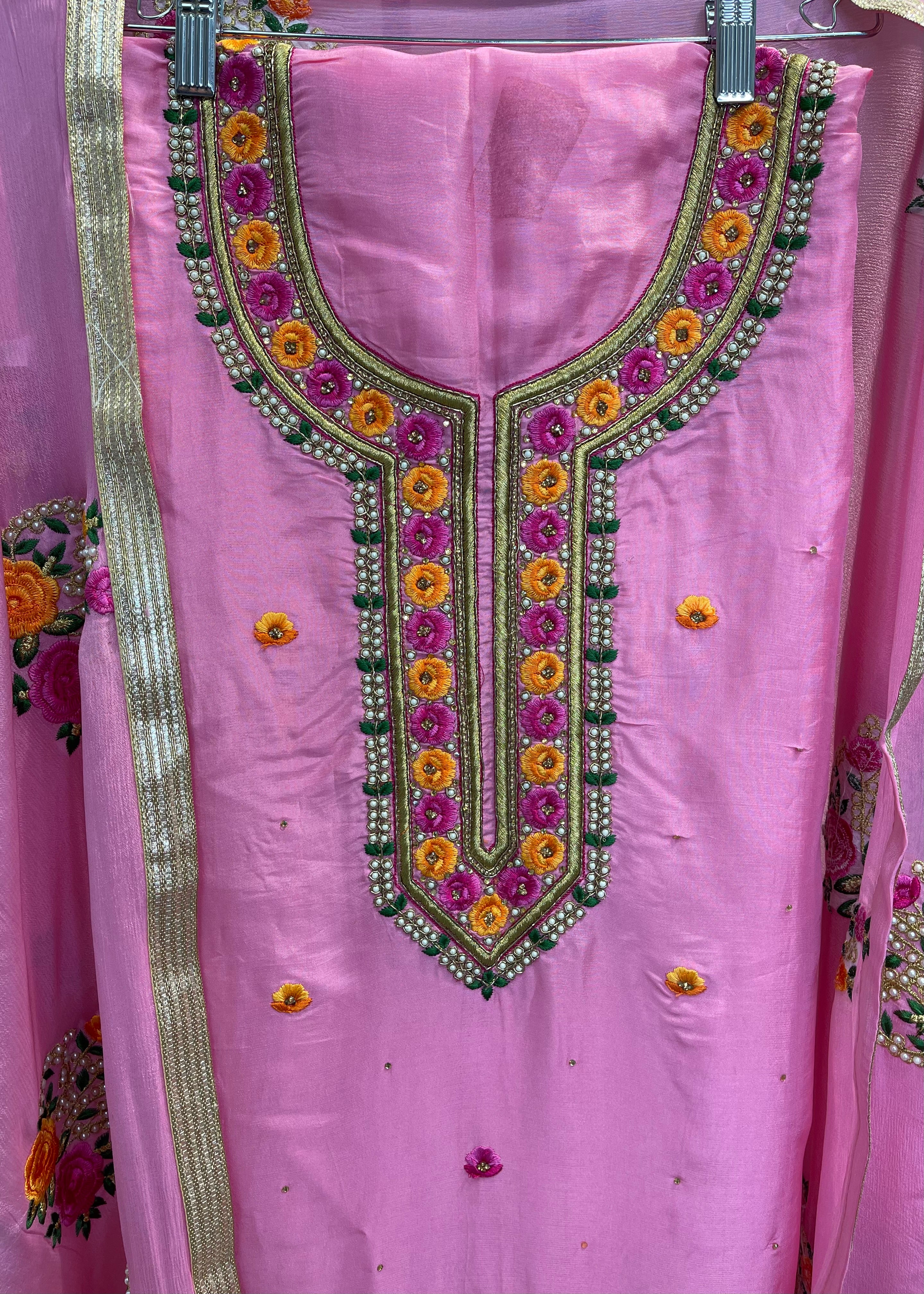 Organza based unstitched suit with heavy hand work suit