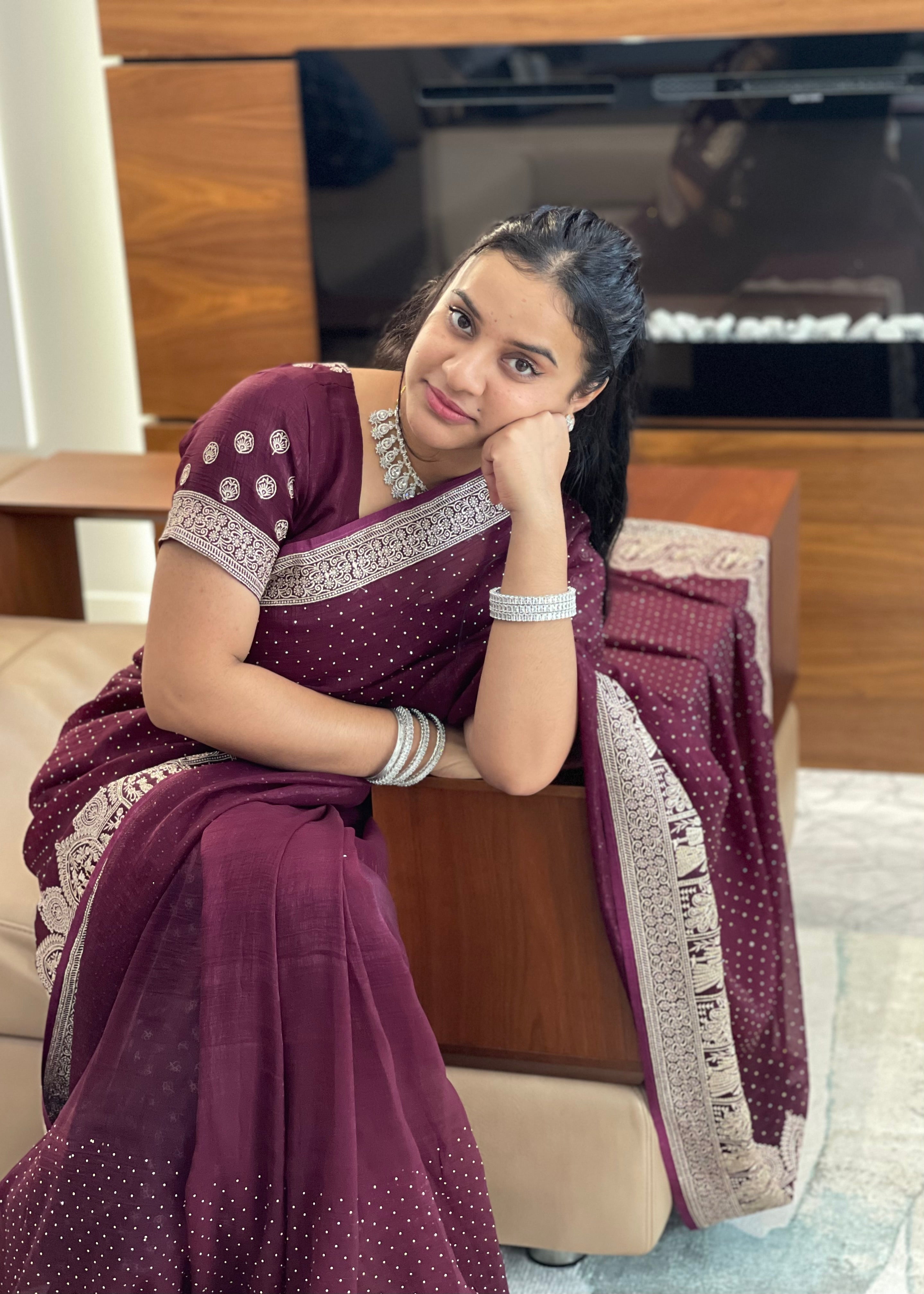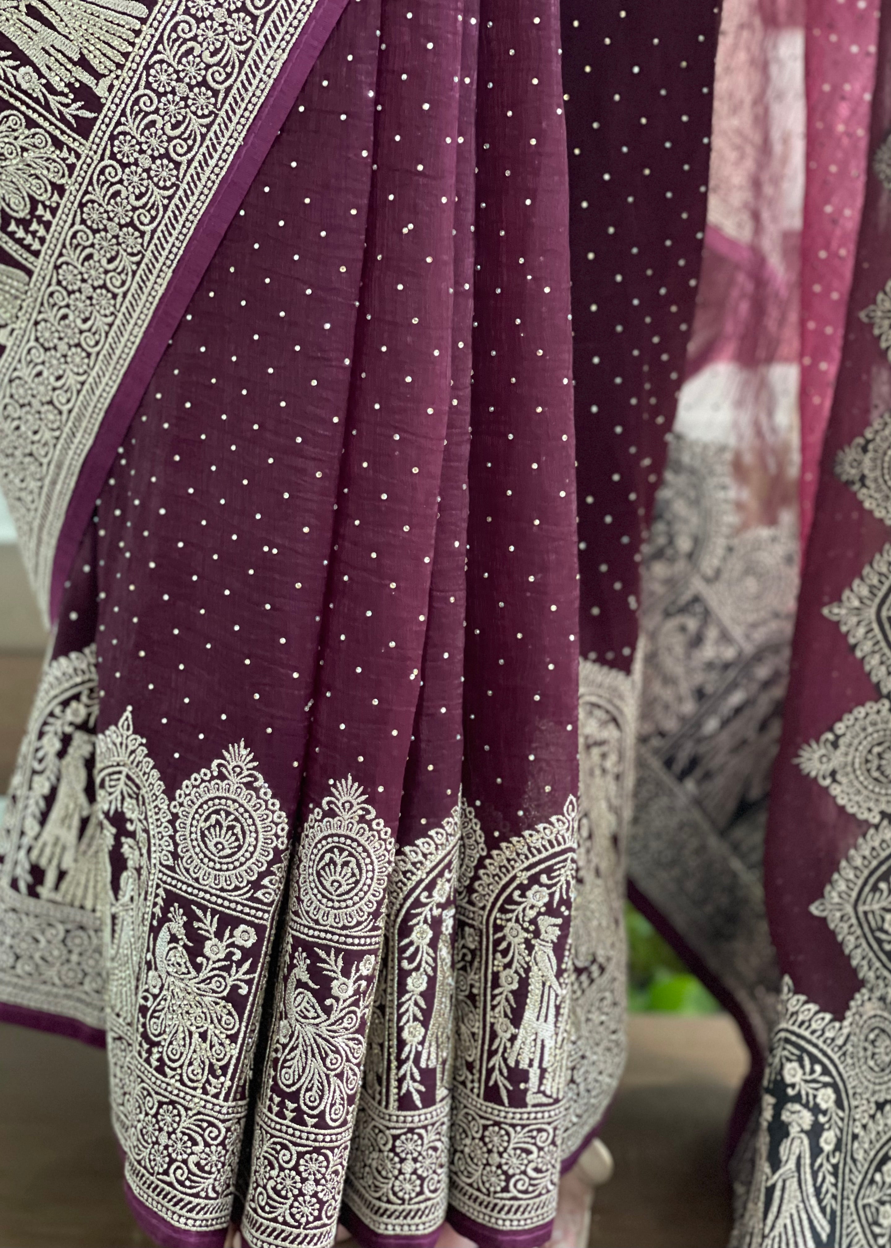 Saree in shimmer fabric with gold embroidery on it ,in doli style pattern, with medium size blouse.