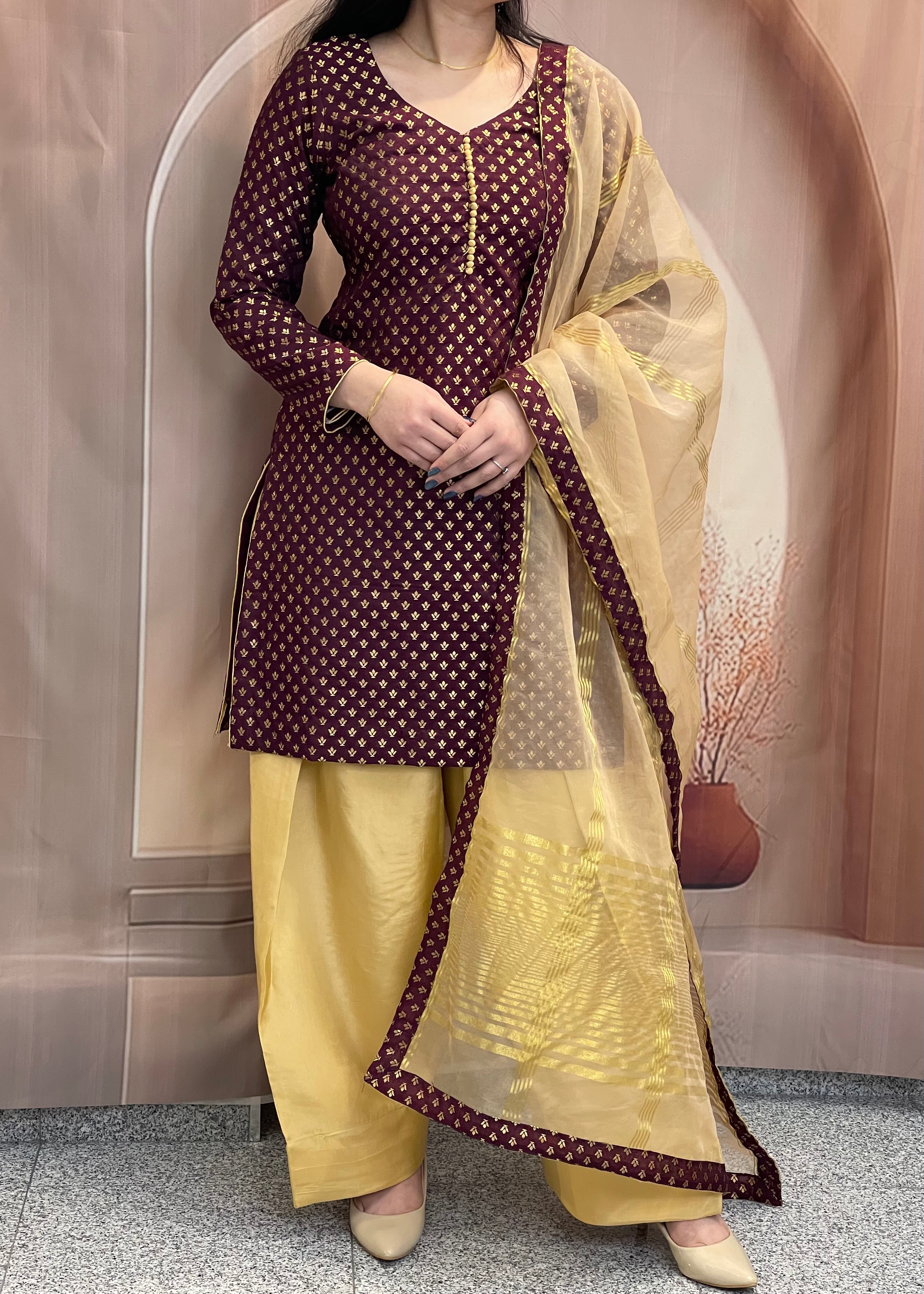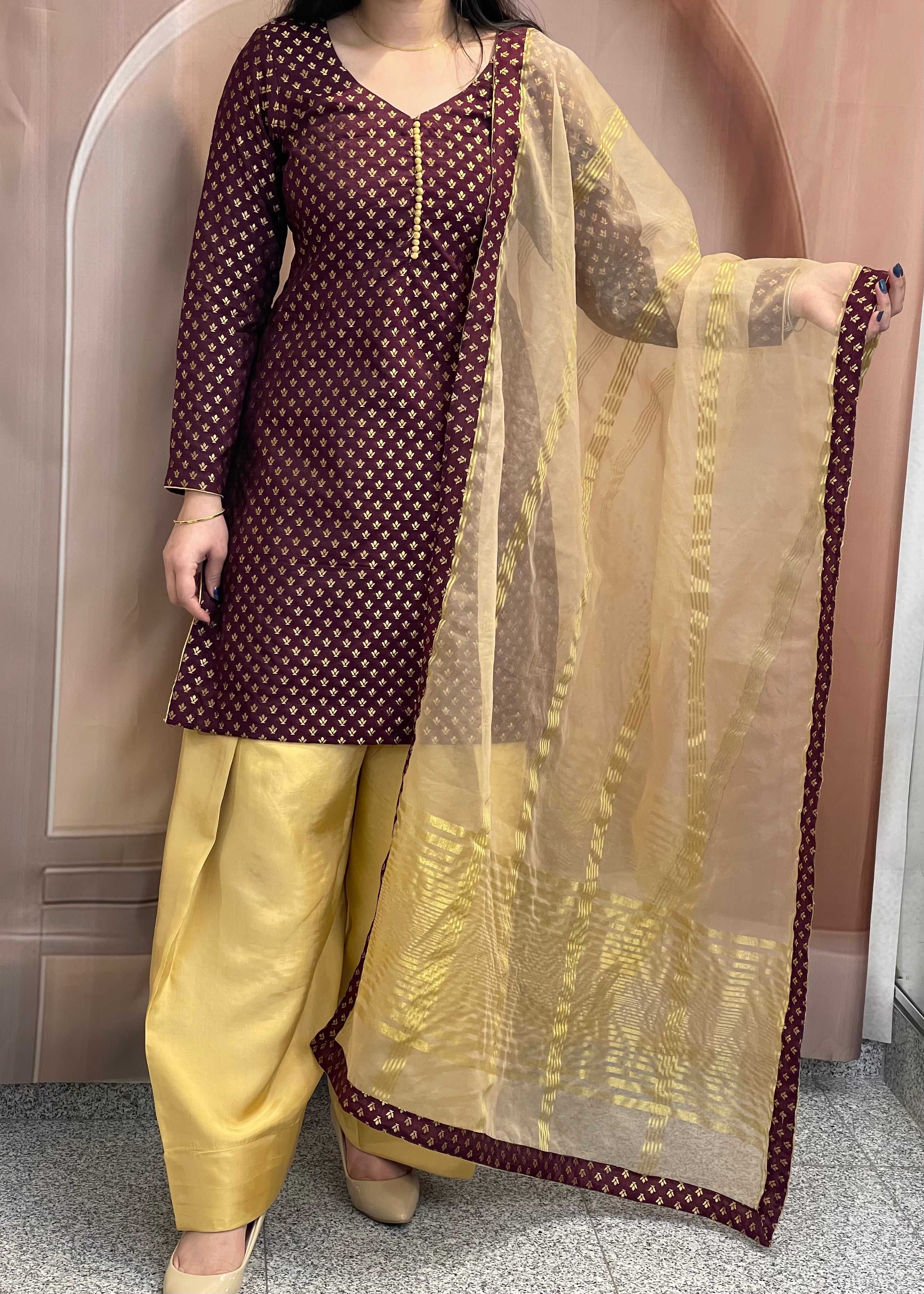 This elegant three-piece suit features a rich washable brocade kurta with gold foil motifs and button detailing. It is perfectly paired with comfortable soft silk bottom salwars and a lightweight, shimmering organza dupatta. A sophisticated blend of traditional texture and modern ease, ideal for any festive occasion.