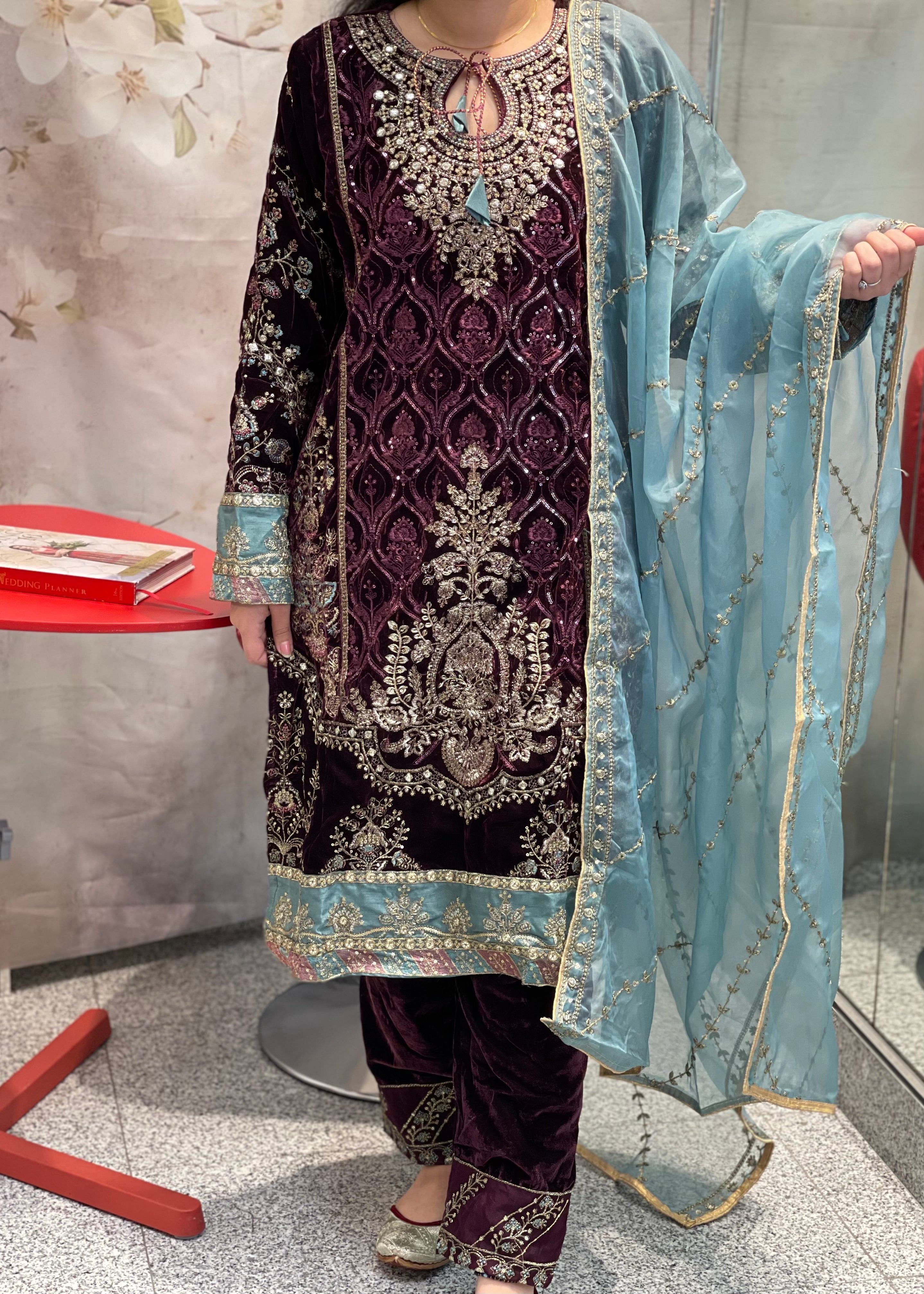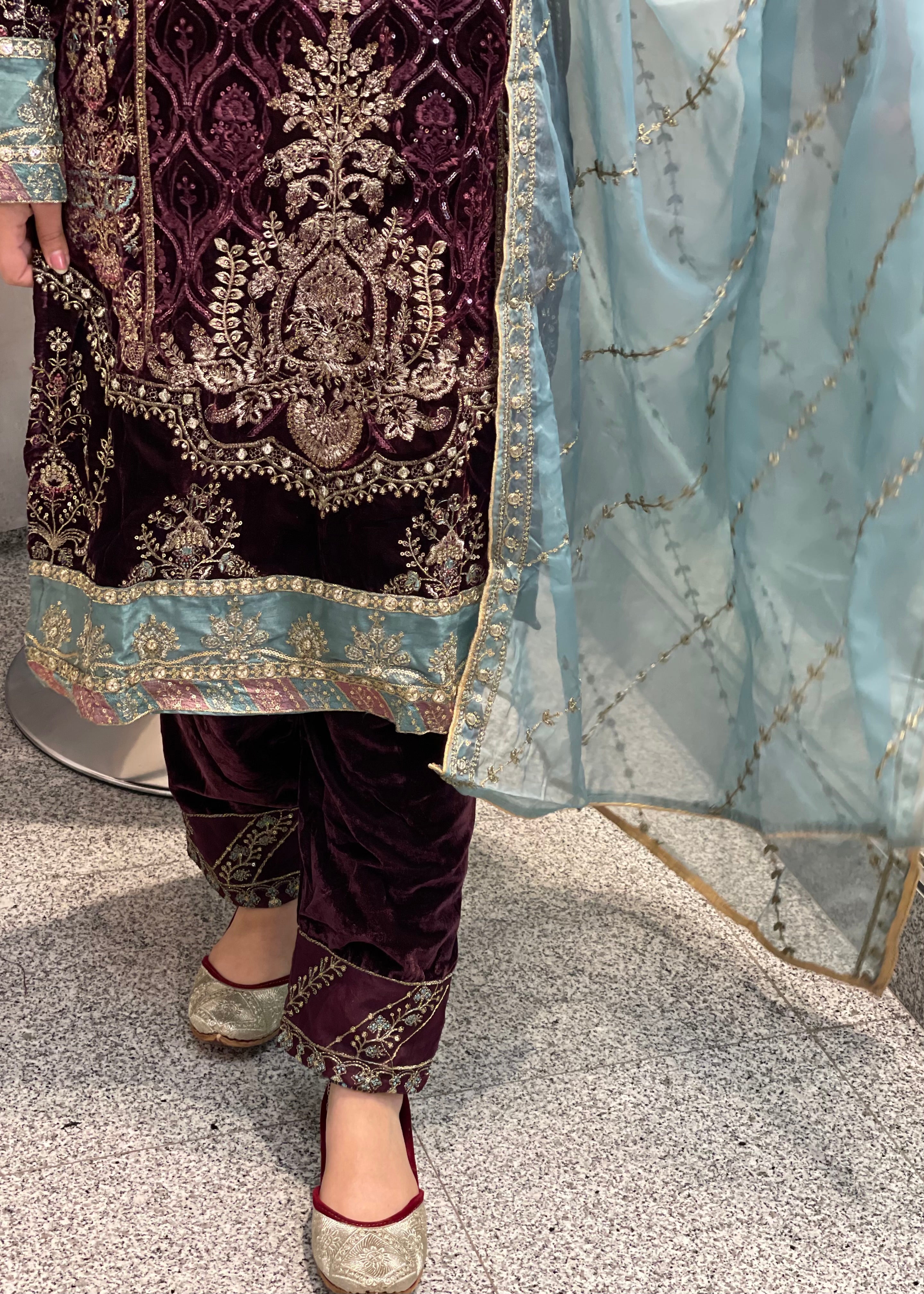 Plum color Trouser suit in velvet fabric with contrast orgenza dupatta in blue color.