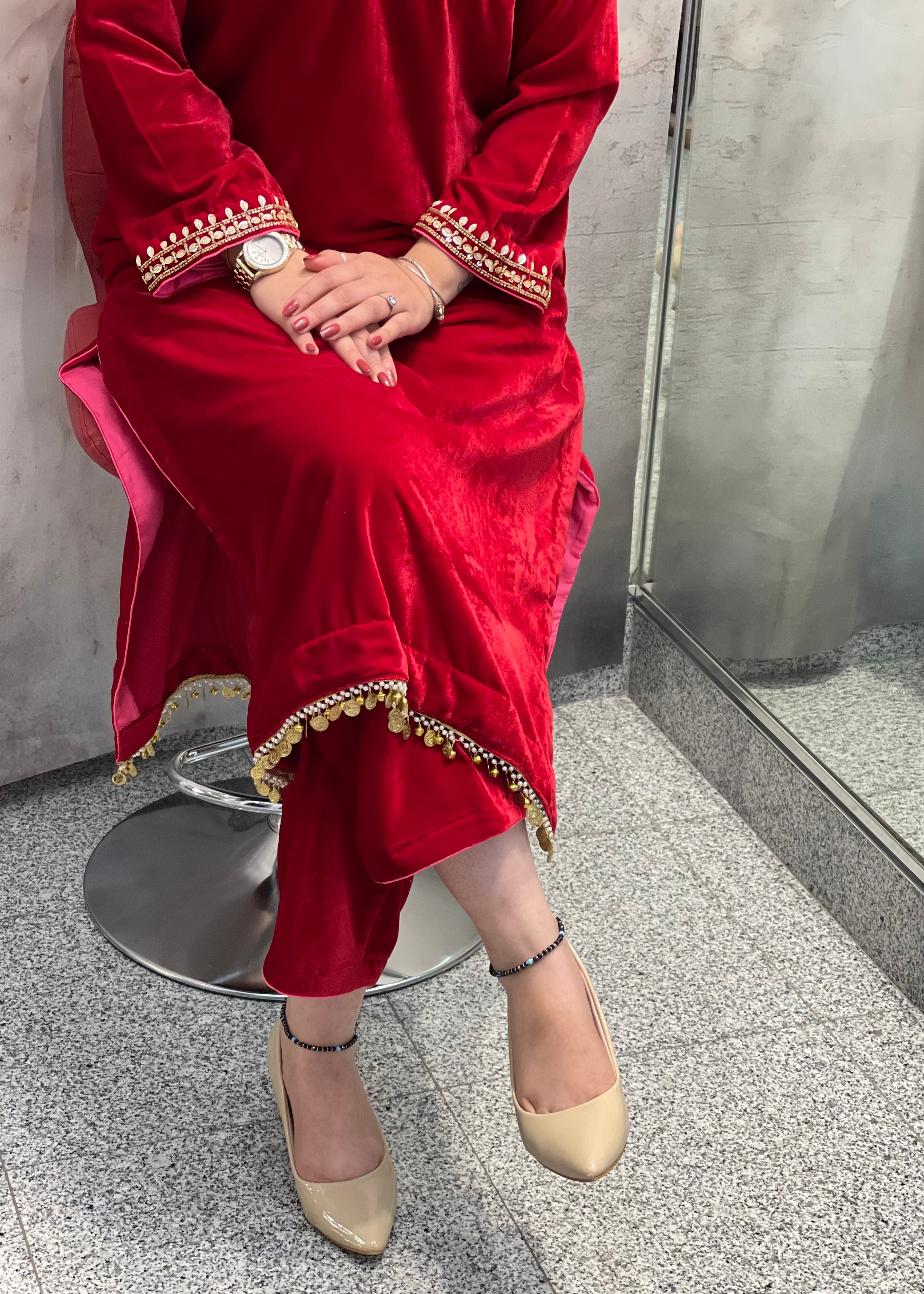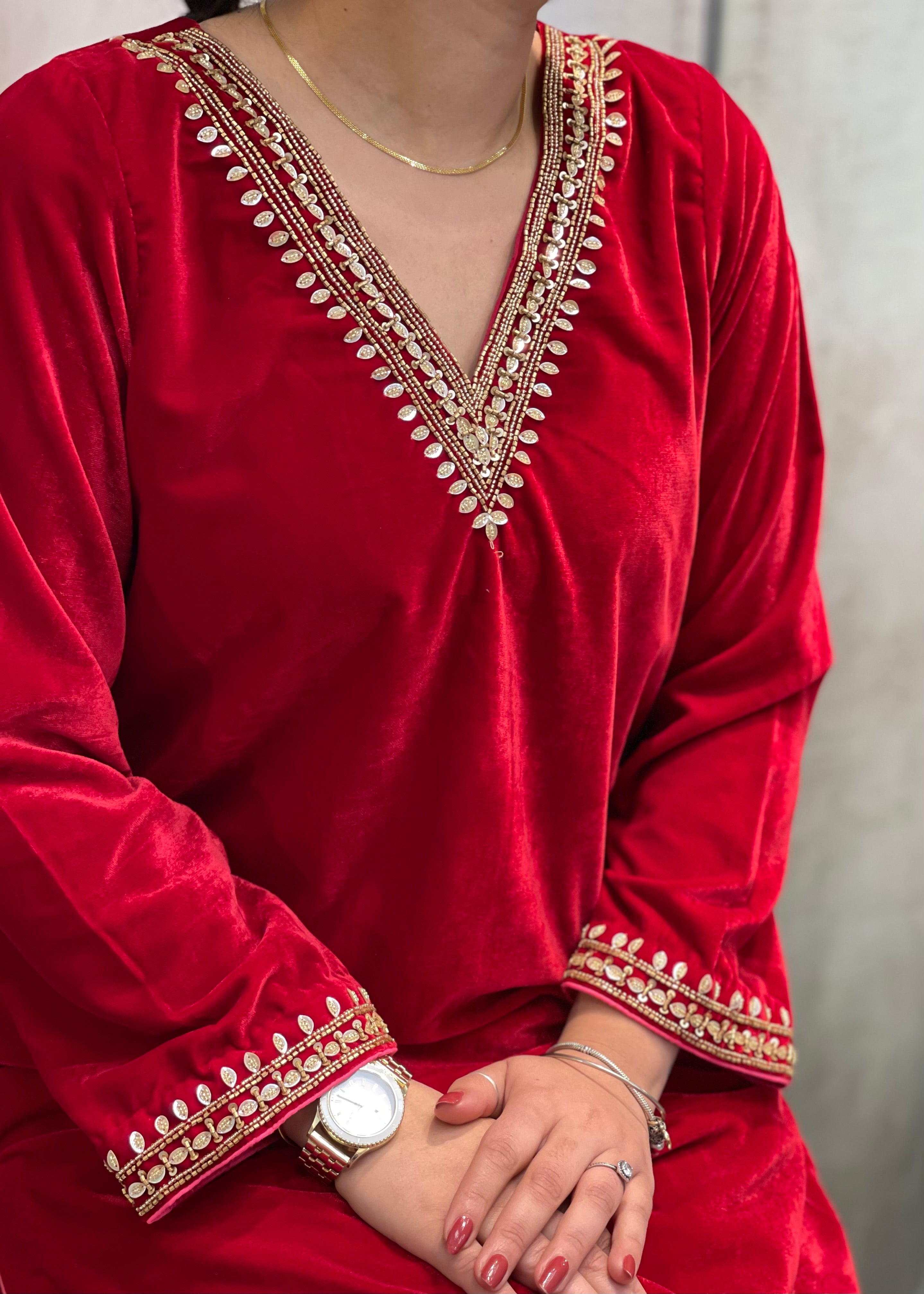 Trouser suit in velvet fabric with embroided neck and sleeves.