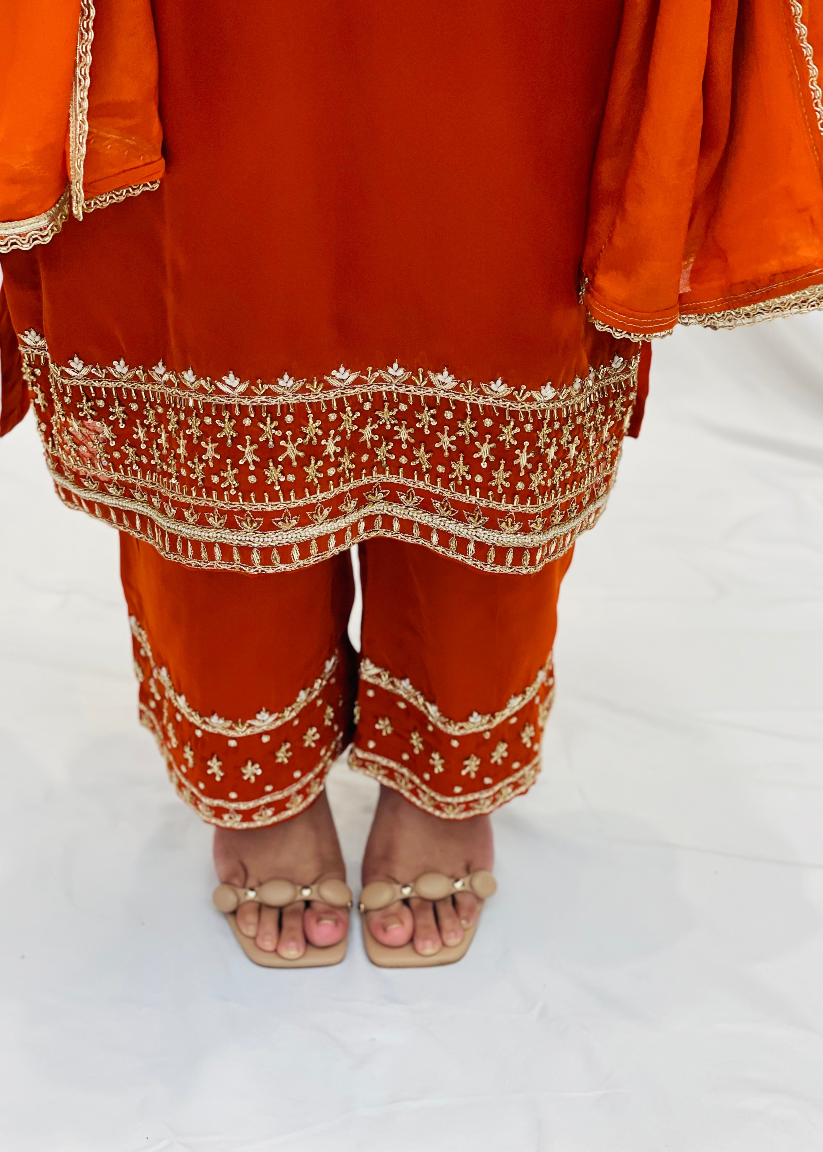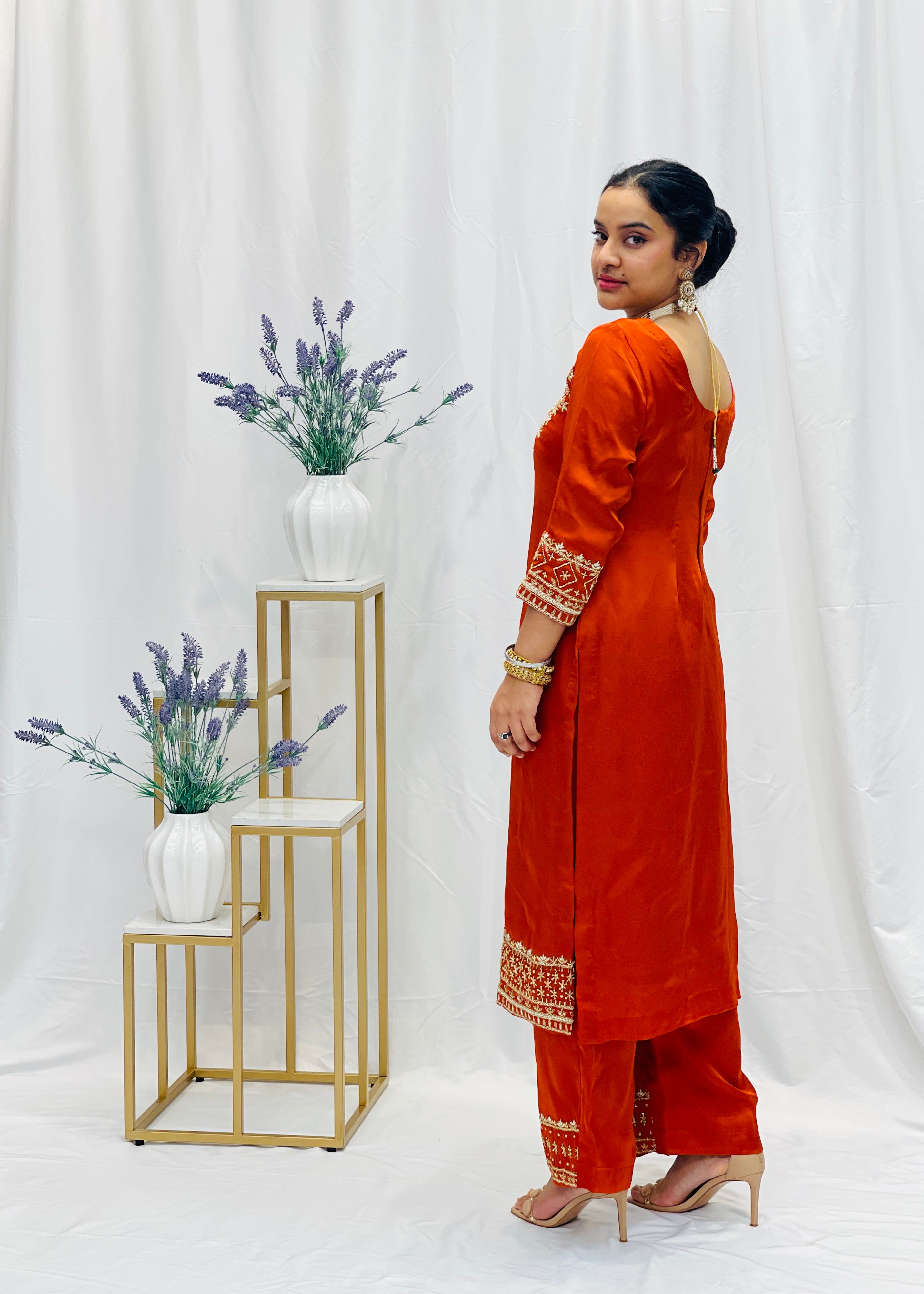Designer Trouser suit in size medium. This outfit comes in pure fabric with handwork embroidery on the neck,sleeves, borders and also on the trouser.